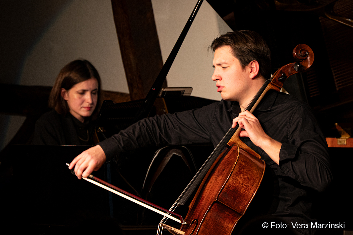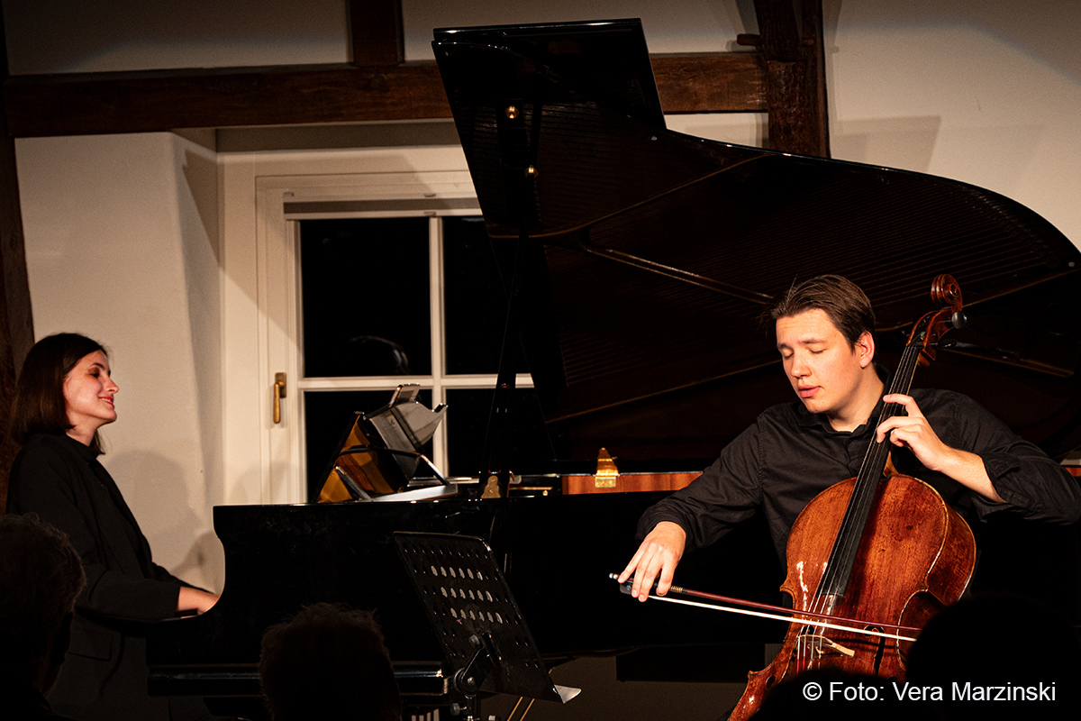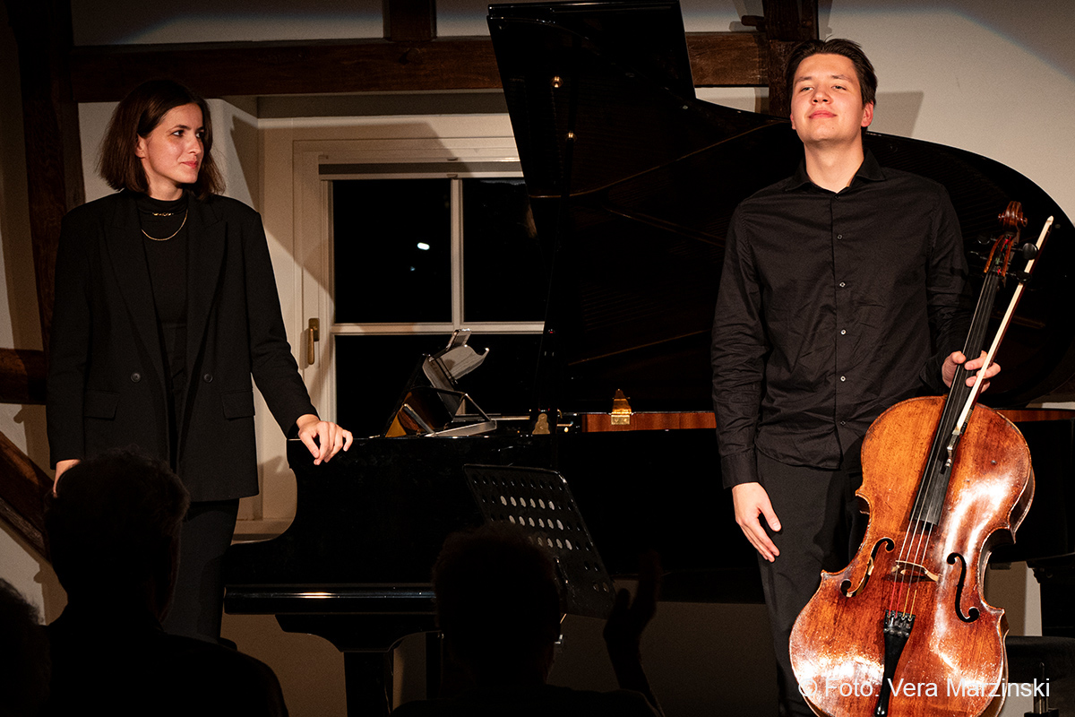 Michael Wehrmeyer und Dina Ivanova bescherten dem Publikum im Burghaus Bielstein als Duo mit Violoncello und Klavier ein außergewöhnliches Klassik-Erlebnis. Kurzfristig hatte es eine Programmänderung für das Konzert mit dem „duo51saiten“ ergeben. Eigentlich wäre Michael Wehrmeyer (Violoncello) mit der Harfenistin Johanna Dorothea Görißen aufgetreten, die gemeinsam das „duo51saiten“ bilden. Görißen hat jedoch das Probespiel für die Akademie-Stelle an der Bayerischen Staatsoper gewonnen, die sie nun antritt und war mit dem Orchester zur Zeit der Bielsteiner Veranstaltung auf einer Tournee in Asien. Doch mit der Pianistin Dina Ivanova brachte Wehmeyer eine brillante Pianistin mit ins Burghaus zum Duo-Konzert.