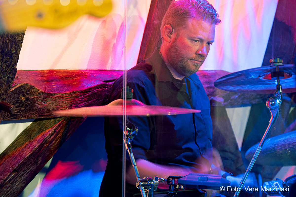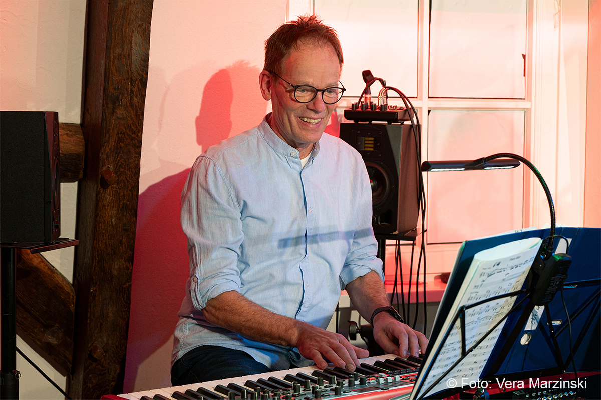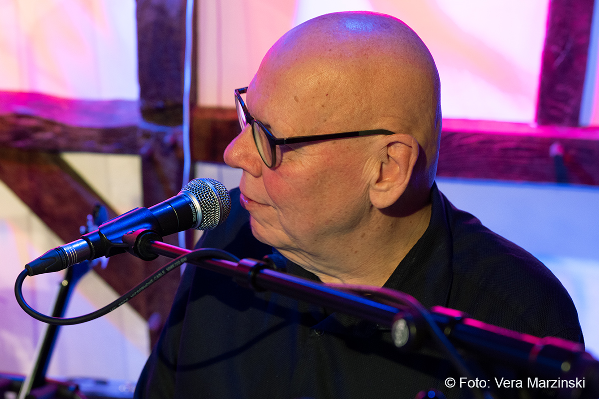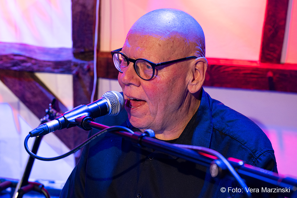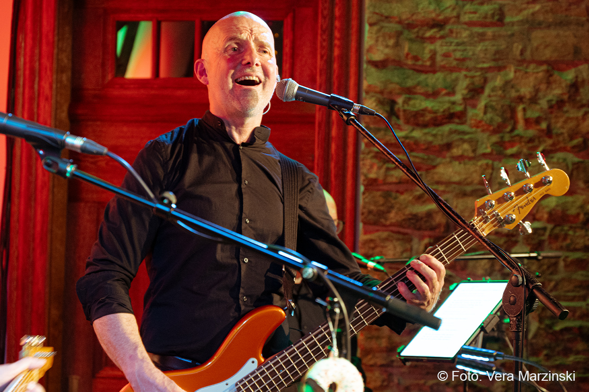 Einen Mix aus eigenen Songs und Coverversionen bekannter Hits, wie „The sun aint gonna shine no more“ oder „Never felt like this bevor“ im ersten Teil. Dazu moderierte Bandleader Ernie Wirth und erzählte ein paar Anekdoten und Geschichten. Richtig ab ging es bei dem Rockabilly Stück „Rock this town“ von den Stray Cats – grandios gesungen von Martin Grund. Gleichzeitig Bass spielen und dabei so super singen ist nicht so einfach, aber offensichtlich sehr gut machbar für den Bassisten, den so mancher gerne noch öfter mit Sologesang gehört hätte. Der „Piano man“ der Band, Michael Bielecke, hatte sich natürlich das „Piano Man“ von Billy Joel ausgewählt, zu dem Ernie Wirth auf der Mundharmonika spielte. „Don’t Forget to Dance“ fand seinen Sinngehalt im Text: Man soll nicht vergessen zu tanzen, sobald die Musik beginnt – eine Botschaft, die im Burghaus aufgrund der dicht gedrängten Zuhörer kaum umzusetzen war.