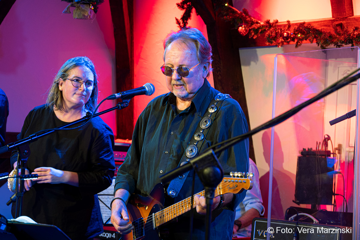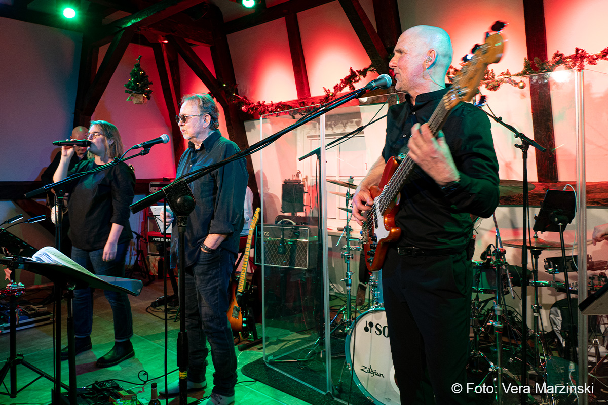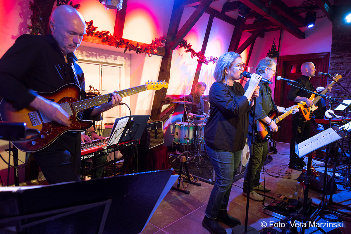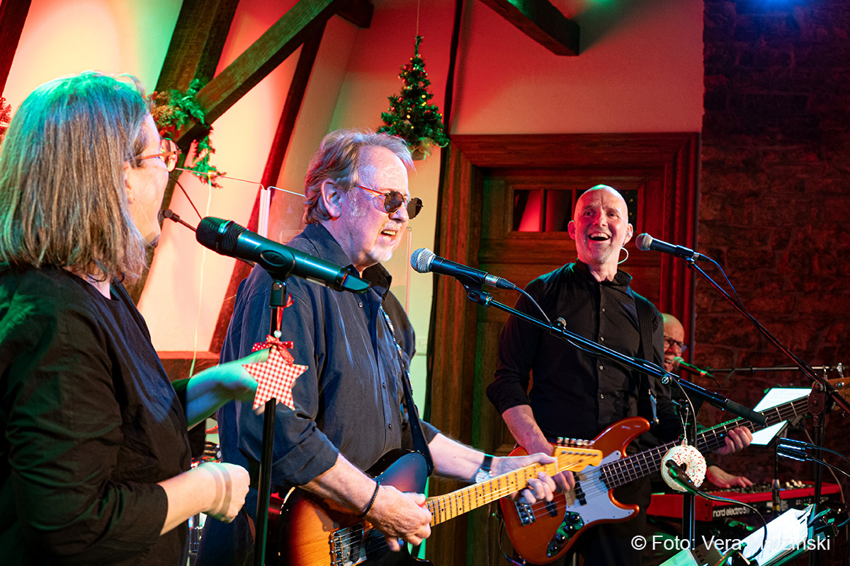 Das Format „Christmas Rock“ wurde einst für das Goller-Haus in Gummersbach erfunden, seit 2017 ist es im Bielsteiner Burghaus zu Gast. Seit letztem Jahr in der Besetzung: Ernie Wirth mit Gitarre und Gesang, Michael Bielecke am Keyboard und Gesang, Sängerin Ramona Even, Gitarrist Manuel Marcos, Volker Marks am E-Piano und für die Rhythmusgruppe Matthias Bielecke am Schlagzeug und Bassist Martin Grund, der auch gesanglich einiges beisteuerte. Im ersten Teil präsentierten sie ein Programm aus Stücken der letzten Jahrzehnte, ehe Christmas-Klassiker wie „Rockin’ Around the Christmas Tree“ und weitere weihnachtliche Songs erklangen.