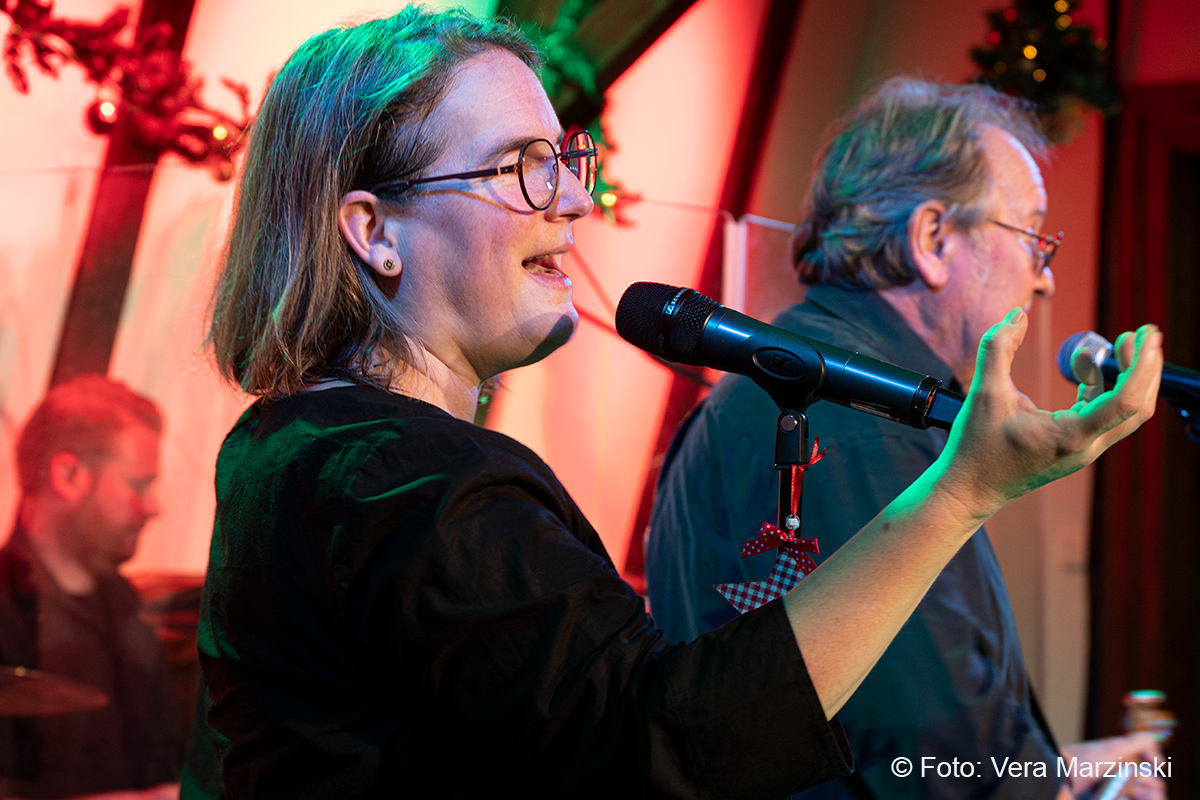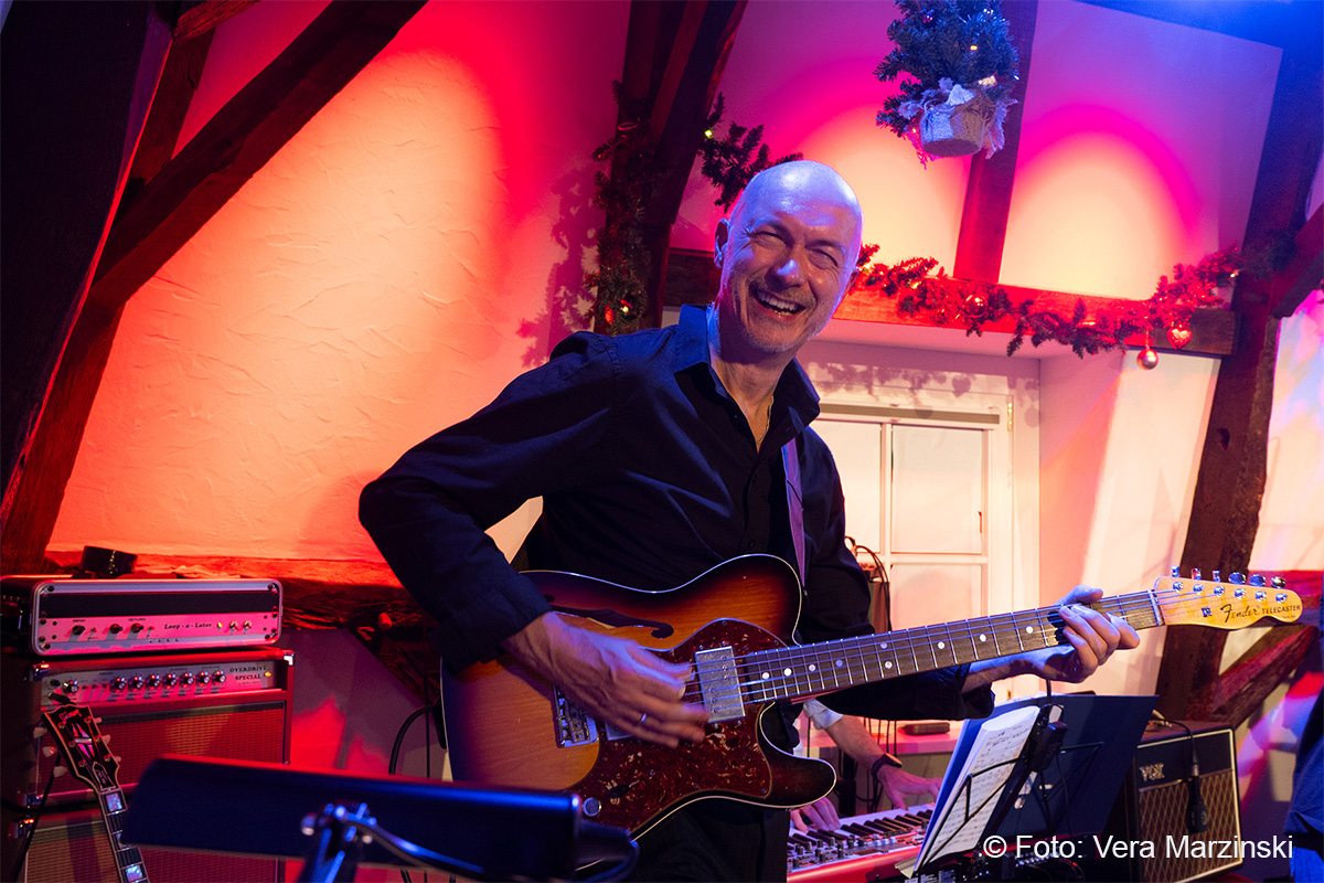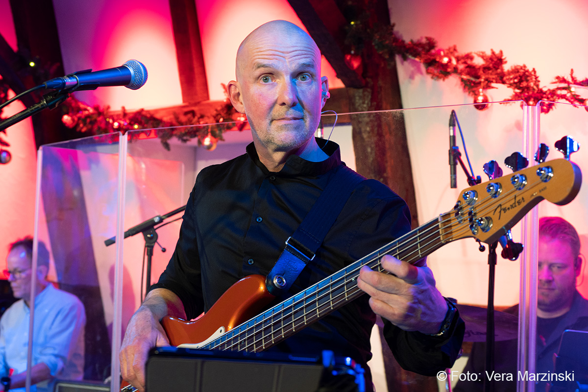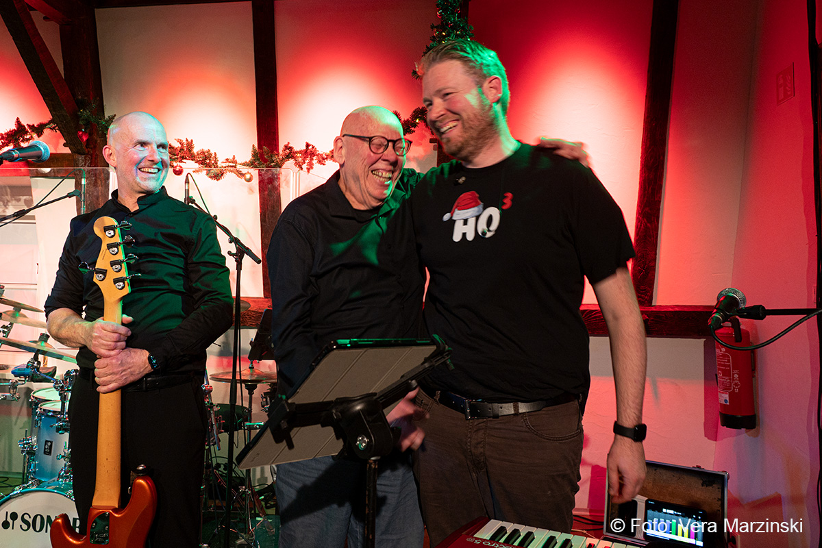 Neueste Ausrüstung zeigte Manuel Marcos mit einer Gibson Les Paul, die nicht nur bei „Rock This Town“, sondern auch bei dem eigenständigen Stück „Shelter“ glänzte, gesungen von Wirth und Bielecke, der am Keyboard zusätzliche Fusion-Sounds beisteuerte. Bei „Angel“ bekam Michael Bielecke Unterstützung vom Burghaus-Publikum-Chor, der von Wirth zu einem gemeinsamen „Feliz Navidad“ angeleitet wurde – eine Performance, die vom ehemaligen Lehrer mit der Bewertung „gut“ versehen wurde. Ramona Even brachte mit Gloria Estefans „Love on Layaway“ echtes Christmas-Feeling auf die Bühne, und bei „This Christmas“ entzündete sie erneut großen Jubel im Saal. Ein berührendes „Put a Candle in the Window“ erhielt eine zusätzliche Gitarreneinlage von Manuel Marcos, während „Driving Home for Christmas“ für Martins Grunds Tochter dargeboten wurde. Den Abschluss bildeten Guildo Horns „Unter dem Weihnachtsstern“ mit Trommelwirbeln von Matthias Bielecke, gefolgt von einem flotten „Santa Claus Is Coming to Town“ und einem besinnlichen Finale von Ramona Even mit „The Way Old Friends Do“.