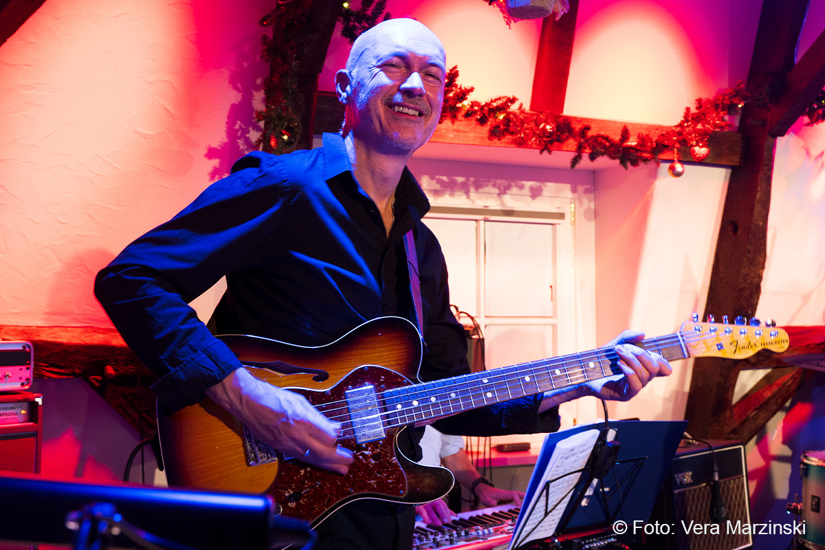 „Mit Plätzchenduft und Kerzenschein, lasst uns glücklich sein!“ - zudem tauchten im rot-grünen Bühnenlicht noch ein paar kleine Weihnachtsbäume auf. Die „Ernie Wirth Band“ hatte zum „Christmas Rock“ ein breitgefächertes Repertoire mit Stücken von den Beatles, den Beach Boys oder auch von Billy Joel und im zweiten Teil den musikalisch-weihnachtlichen Part.