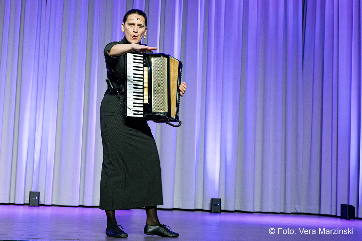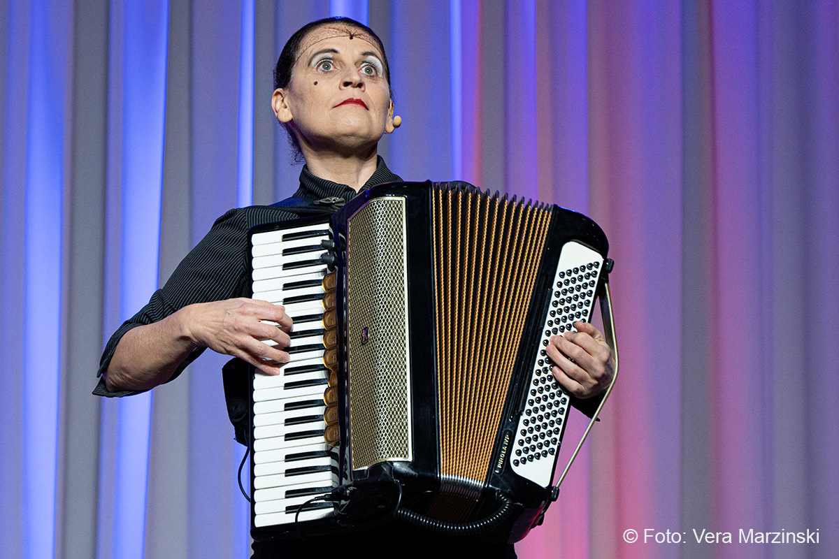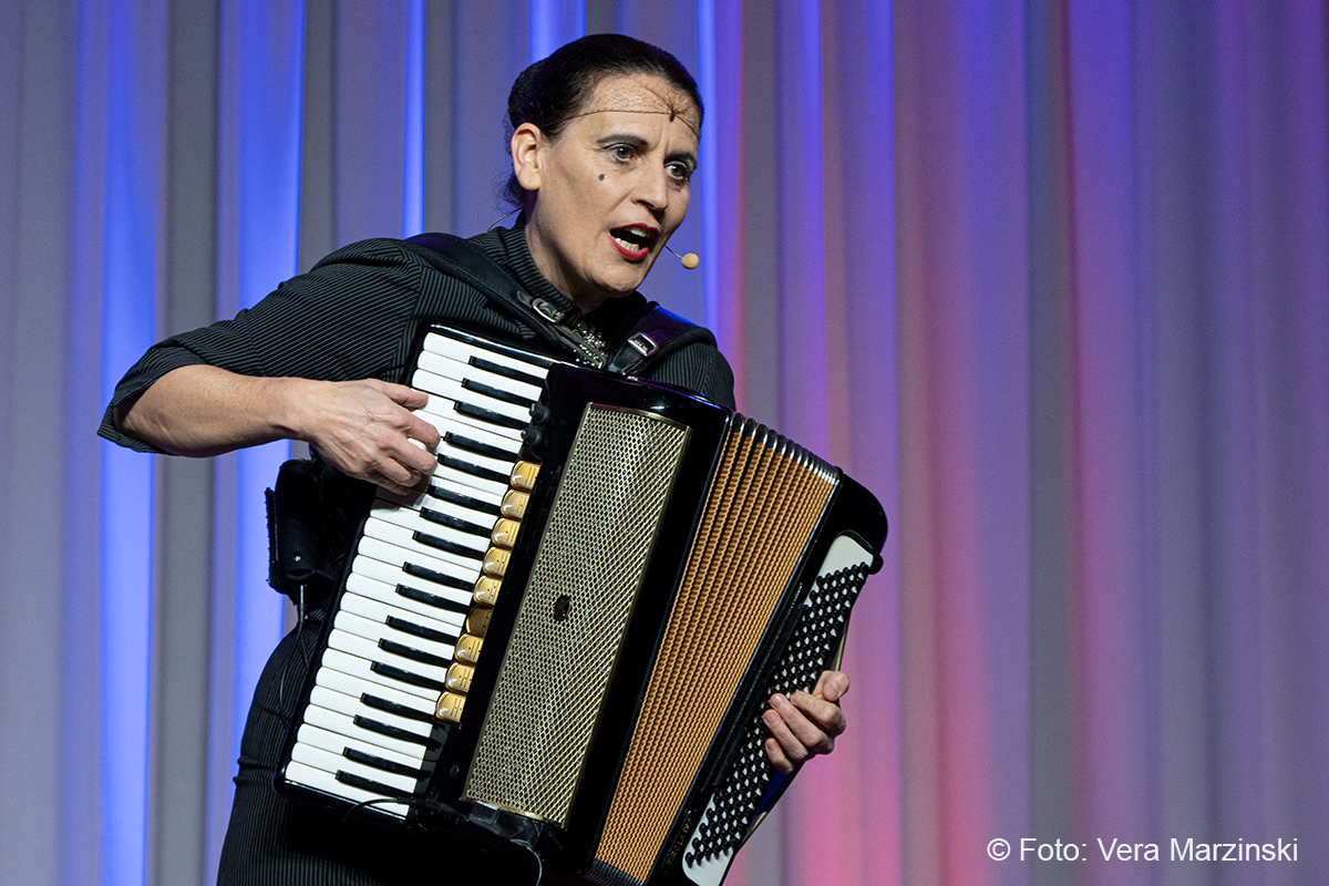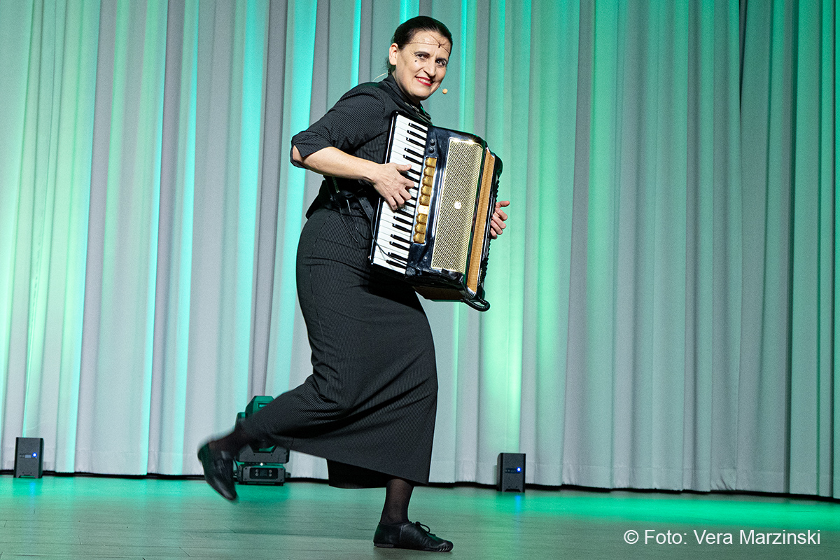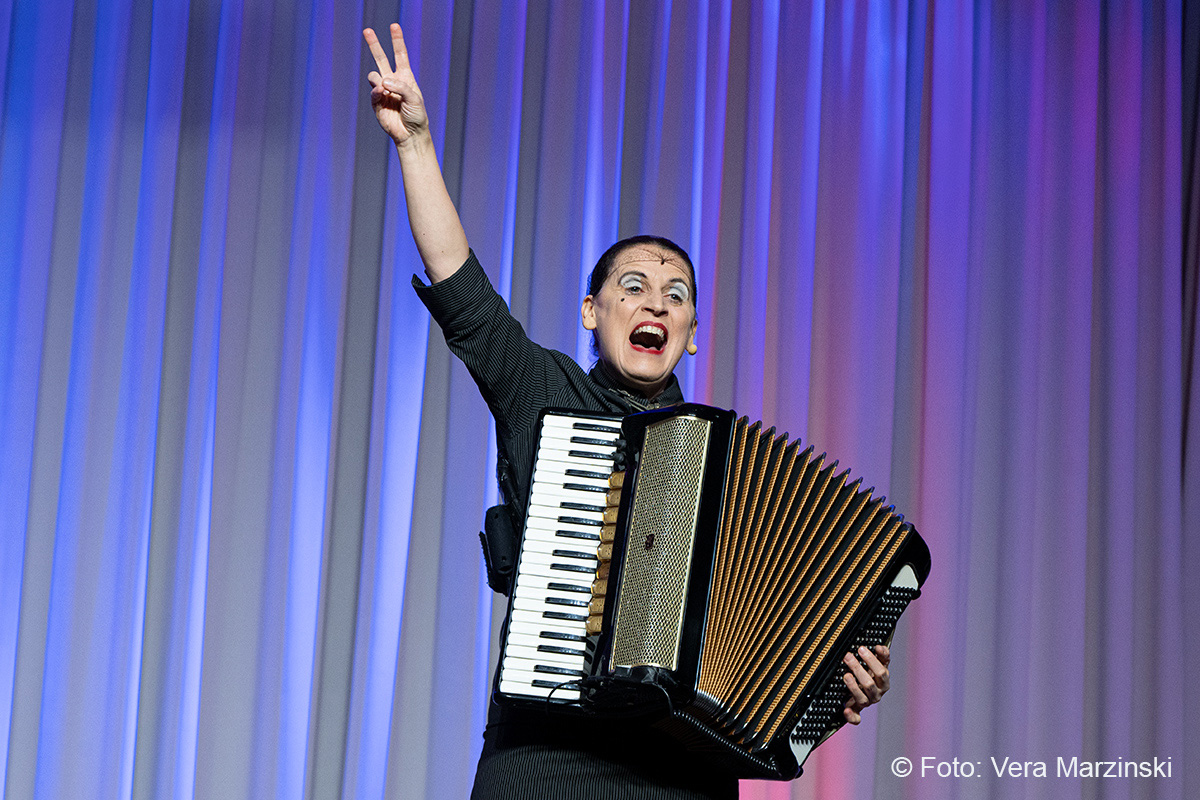 Im ausverkauften Stadtteilhaus blickte „La Signora“ in ihrer Show „Froschkönigin“ auf 20 Jahre Bühnenkarriere zurück und zeigte als Showgirl ihr Jubiläumsprogramm wahlweise mit ihrem Akkordeon, verbal oder auch mal wild tanzend und hüpfend