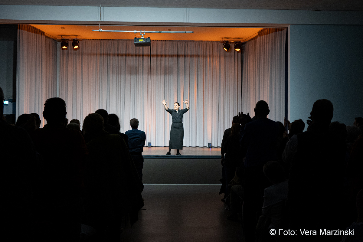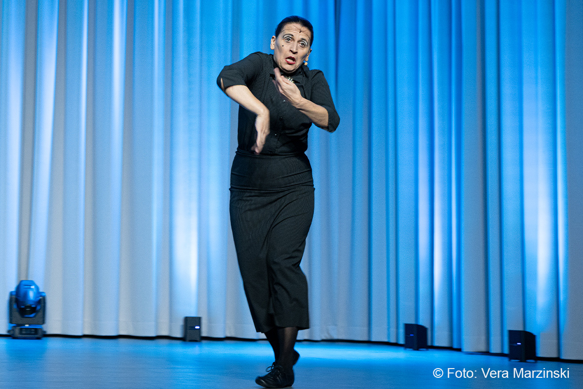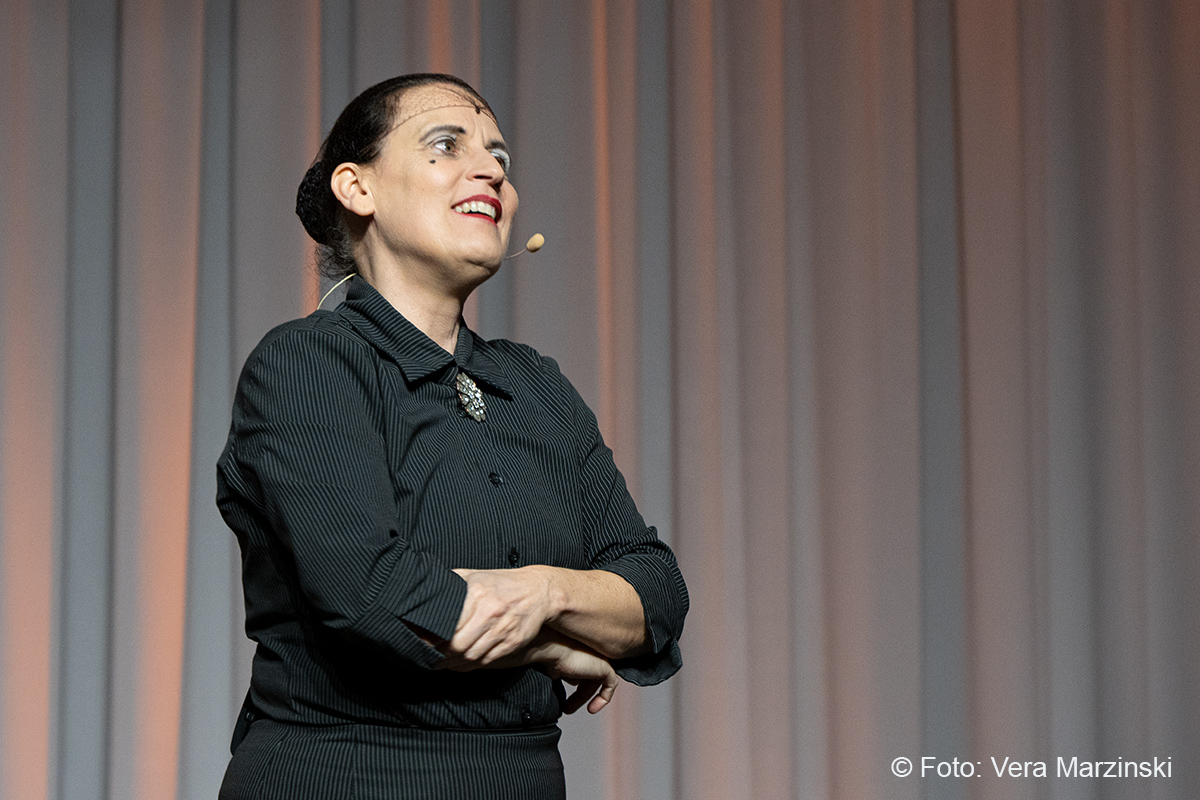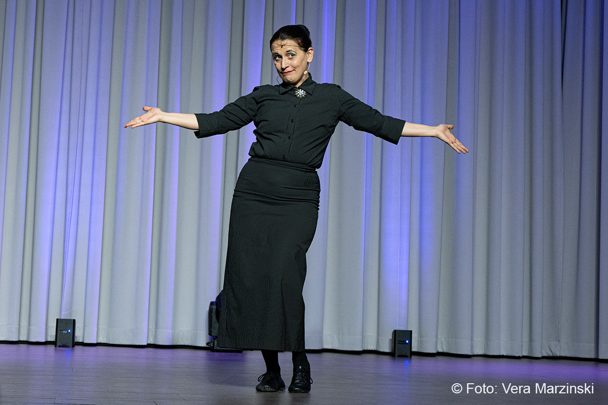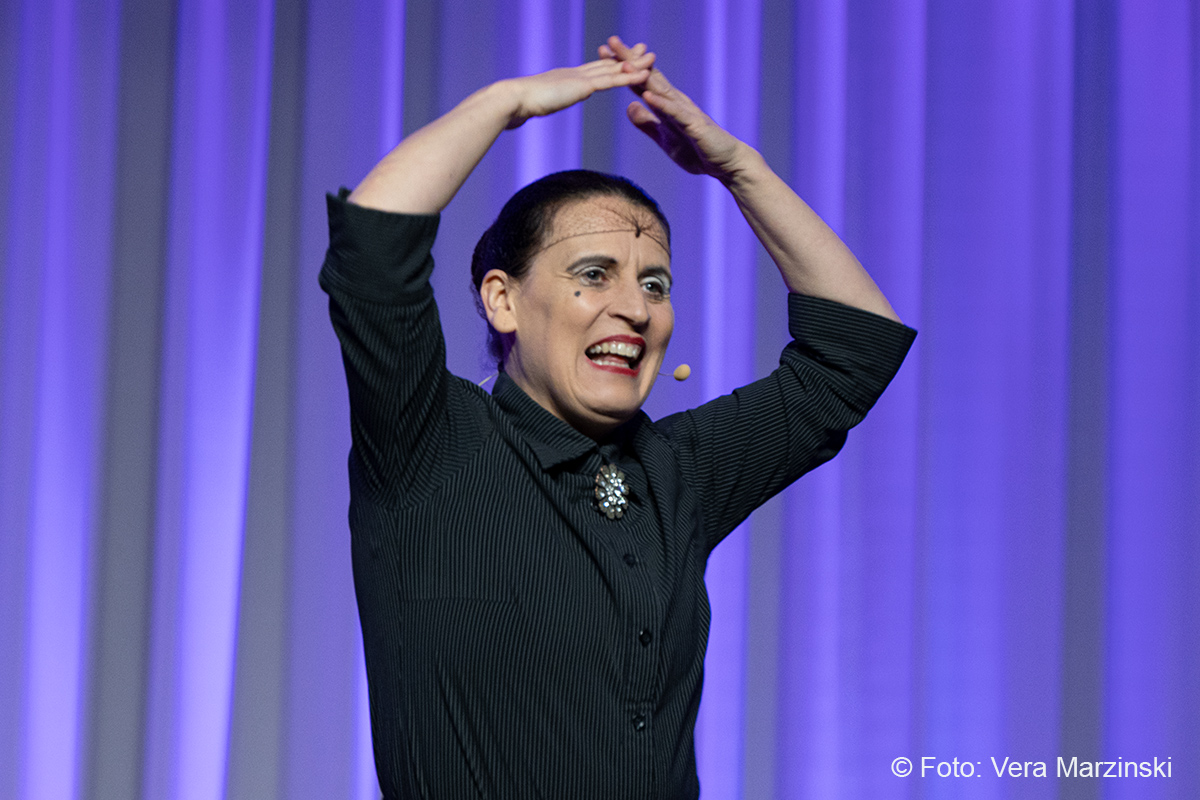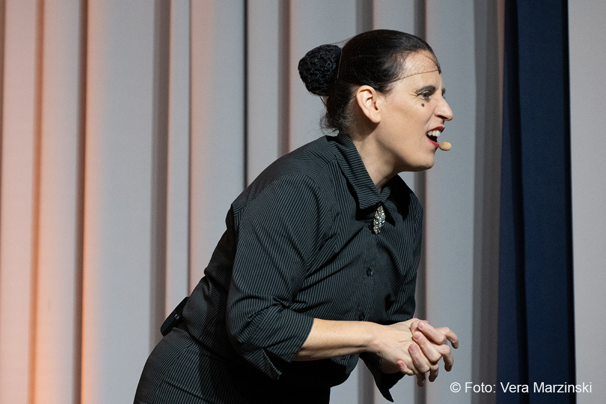 Im ausverkauften Stadtteilhaus blickte „La Signora“ in ihrer Show „Froschkönigin“ auf 20 Jahre Bühnenkarriere zurück und zeigte als Showgirl ihr Jubiläumsprogramm wahlweise mit ihrem Akkordeon, verbal oder auch mal wild tanzend und hüpfend