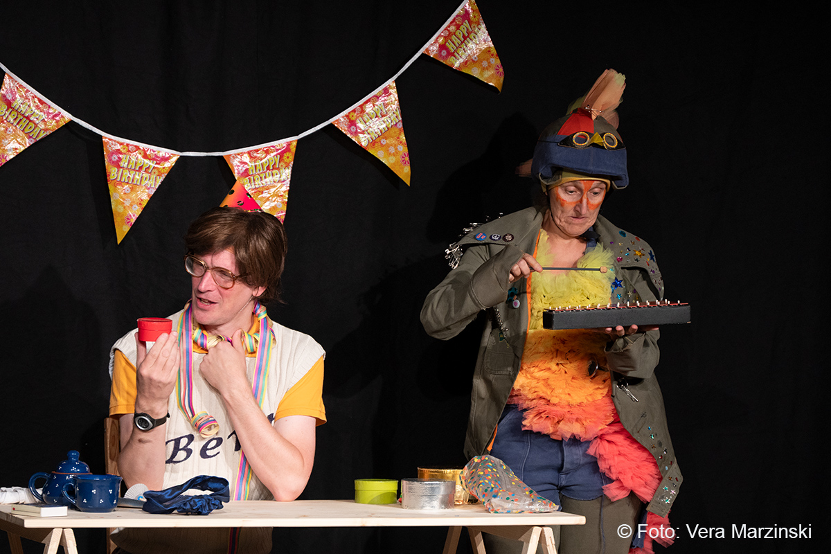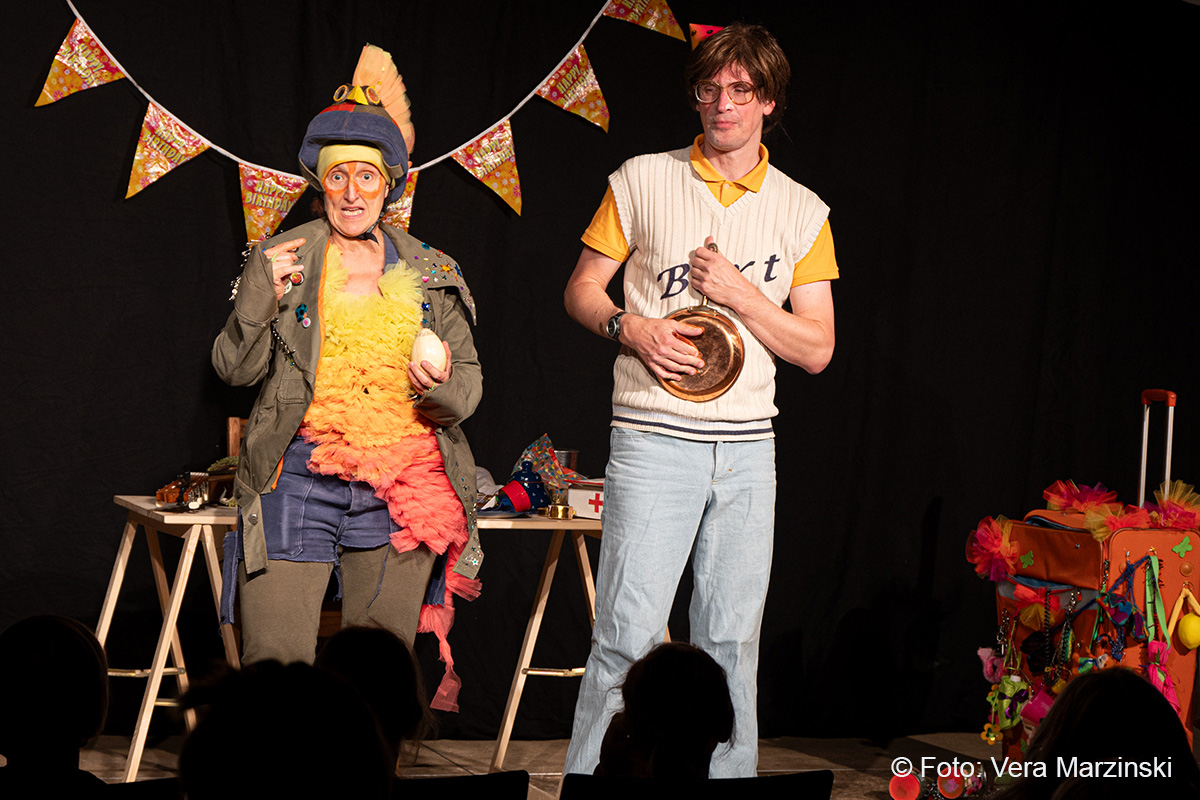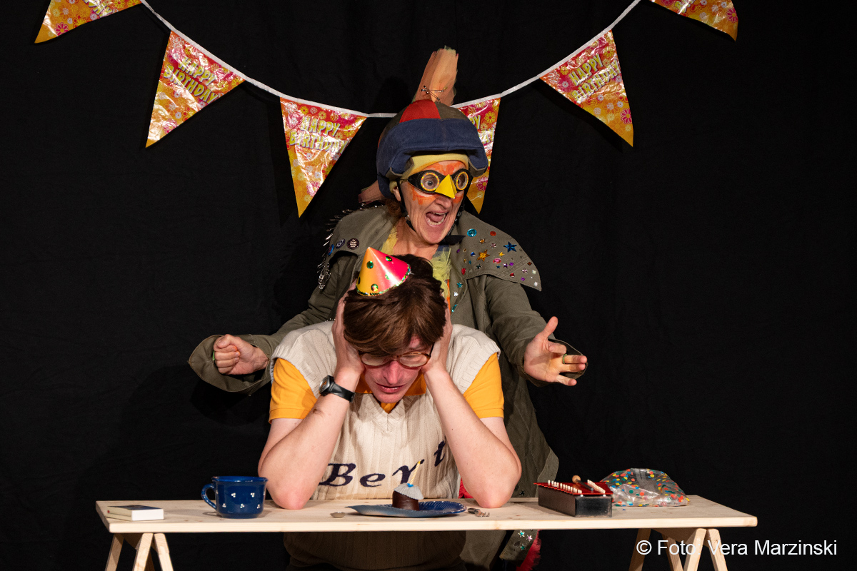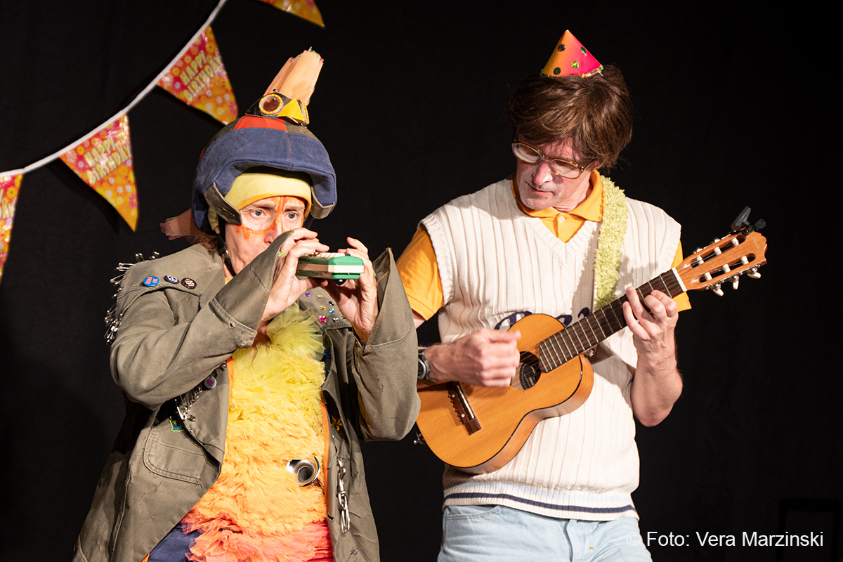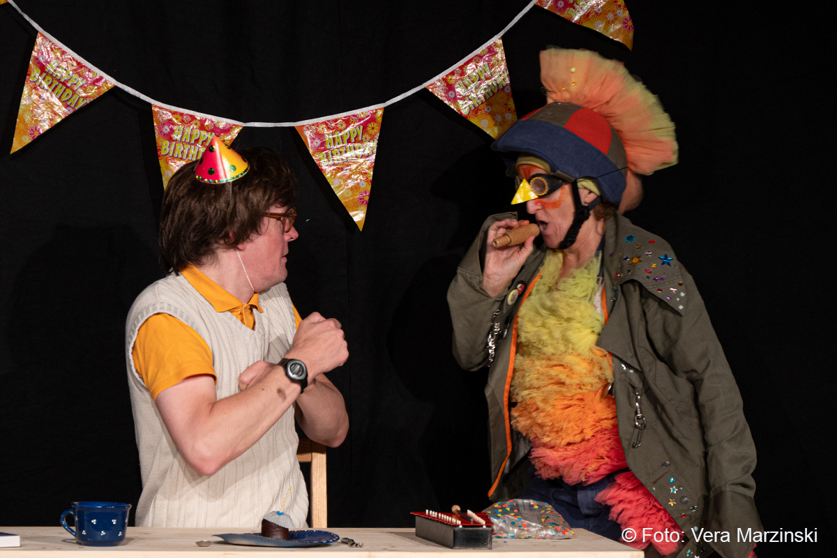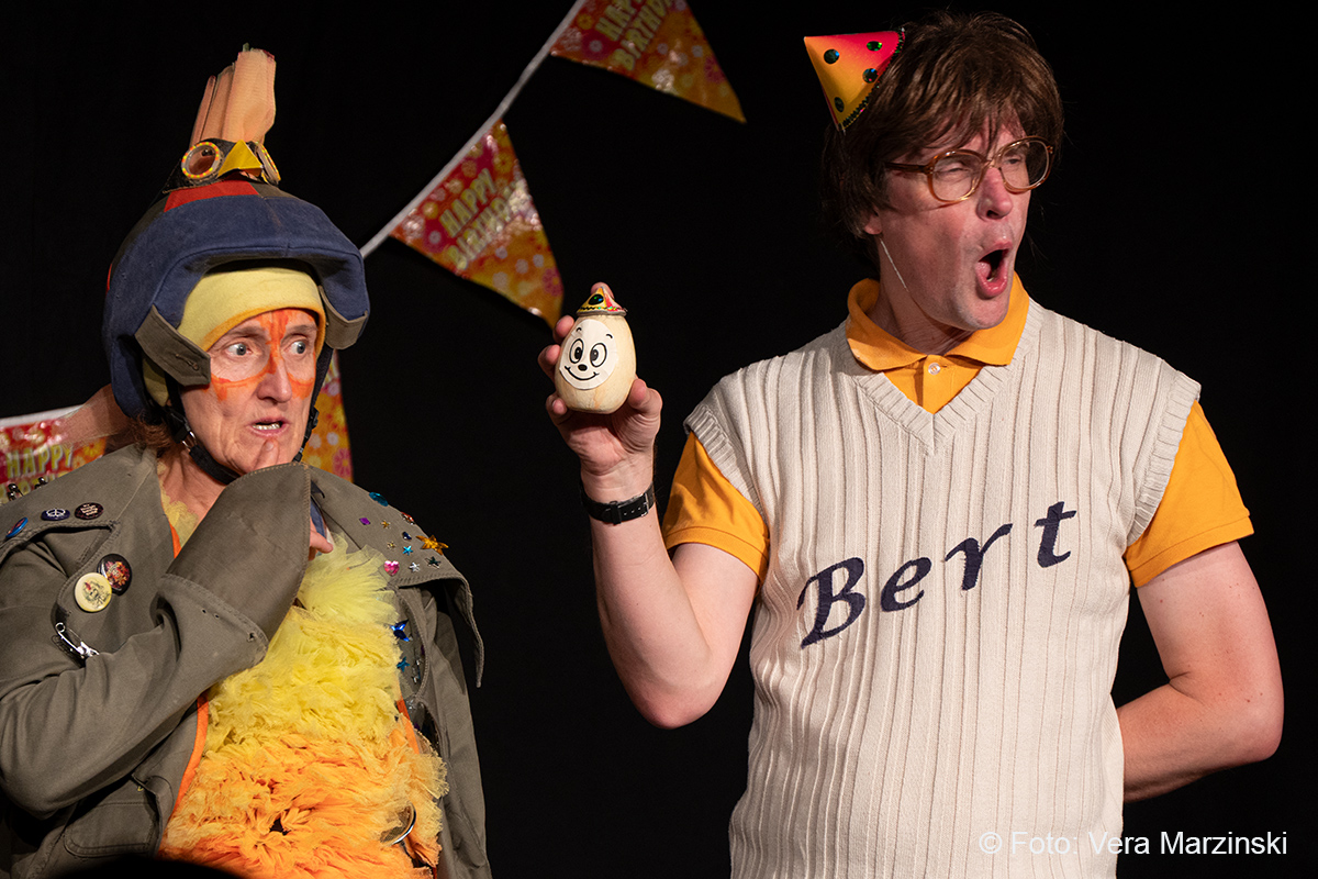 „R.A.M. – Happy Bird’s Day“ ist ein englischsprachiges Stück für Kinder im Grundschulalter. Eine „Happy English Lesson“ mit viel Live-Musik und -Gesang. Denn ohne Verständnisschwierigkeiten konnten selbst die kleinsten Gäste in die Fremdsprache eintauchen. Die pointen- und temporeiche Geschichte erklärte sich allein aus den Handlungen auf der Bühne. Da feierte Bert seine „Happy Birthday to me“ -Party mit Konfetti, Musik und gedecktem „table“. Kein Besuch in Sicht - nicht im Treppenhaus, nicht in der Garderobe. Doch dann kam der bunte Vogel „Happy bird“ und sang ein „If you happy and you know it“. Es sei der „Happy bird-day“ und nicht der „birth day“, fand der bunte Vogel. Bert hätte dann wohl doch lieber alleine weiter gefeiert, aber der „Happy Bird“ ließ sich nicht so schnell vertreiben. Der trieb mit Bert zudem auch noch so einigen Schabernack, wie Mehl ins Gesicht pusten oder auch Dosen und Musikgegenstände auf Berts Kopf und Armen stapeln. Die Kinder im Publikum hatten ihren Spaß mit den beiden. Nebenbei erklärten Bert und Bird ganz einfach „empty“ und „full“ – leer und voll – oder auch „up“ und „down“ sowie „in“ und „out“. Und der gekleckerte Tee auf dem Shirt? Das war dann wohl ein T-Shirt. Ei ist egg und wie sollte das frisch gelegte Ei von Bird dann wohl heißen? Natürlich „Eggbert“ oder doch lieber „Eggbird“.
