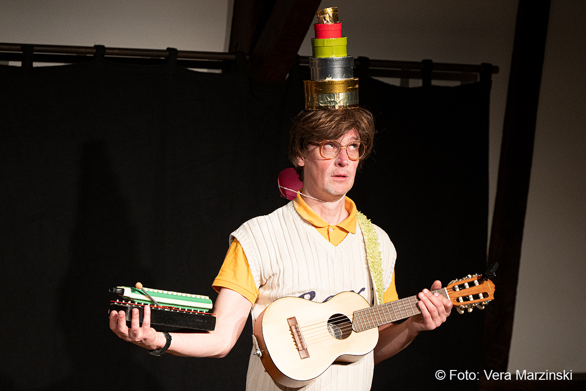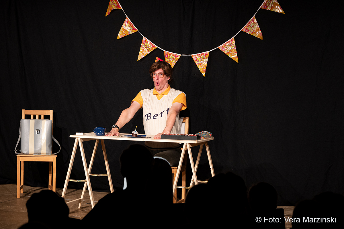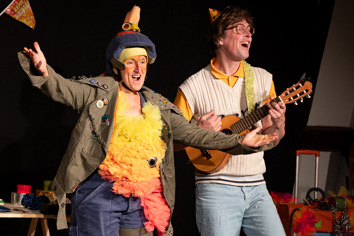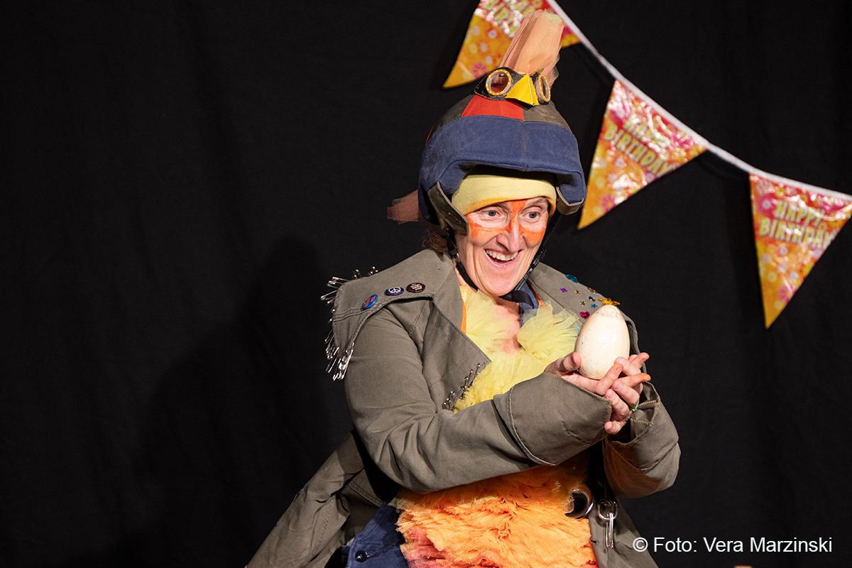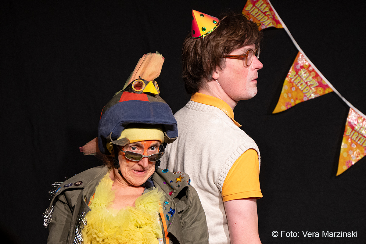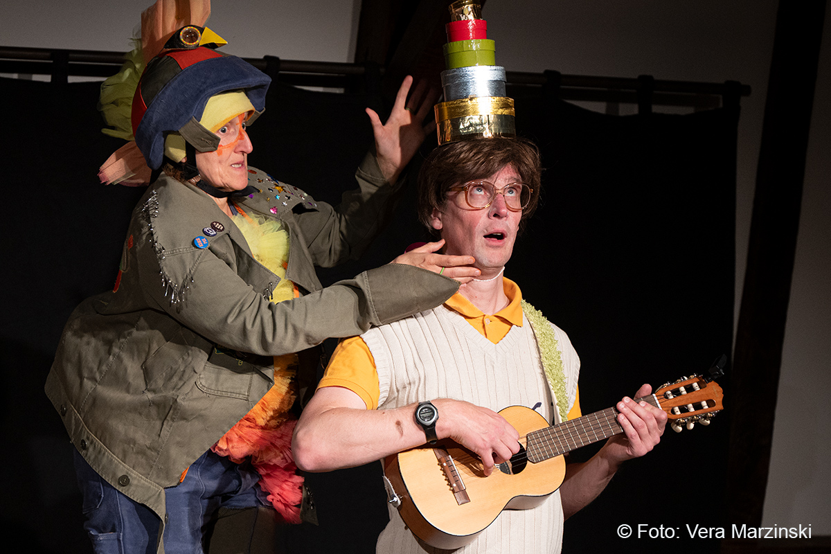 „R.A.M. – Happy Bird’s Day“ ist ein englischsprachiges Stück für Kinder im Grundschulalter. Eine „Happy English Lesson“ mit viel Live-Musik und -Gesang. Denn ohne Verständnisschwierigkeiten konnten selbst die kleinsten Gäste in die Fremdsprache eintauchen. Die pointen- und temporeiche Geschichte erklärte sich allein aus den Handlungen auf der Bühne. Da feierte Bert seine „Happy Birthday to me“ -Party mit Konfetti, Musik und gedecktem „table“. Kein Besuch in Sicht - nicht im Treppenhaus, nicht in der Garderobe. Doch dann kam der bunte Vogel „Happy bird“ und sang ein „If you happy and you know it“. Es sei der „Happy bird-day“ und nicht der „birth day“, fand der bunte Vogel. Bert hätte dann wohl doch lieber alleine weiter gefeiert, aber der „Happy Bird“ ließ sich nicht so schnell vertreiben. Der trieb mit Bert zudem auch noch so einigen Schabernack, wie Mehl ins Gesicht pusten oder auch Dosen und Musikgegenstände auf Berts Kopf und Armen stapeln. Die Kinder im Publikum hatten ihren Spaß mit den beiden. Nebenbei erklärten Bert und Bird ganz einfach „empty“ und „full“ – leer und voll – oder auch „up“ und „down“ sowie „in“ und „out“. Und der gekleckerte Tee auf dem Shirt? Das war dann wohl ein T-Shirt. Ei ist egg und wie sollte das frisch gelegte Ei von Bird dann wohl heißen? Natürlich „Eggbert“ oder doch lieber „Eggbird“.