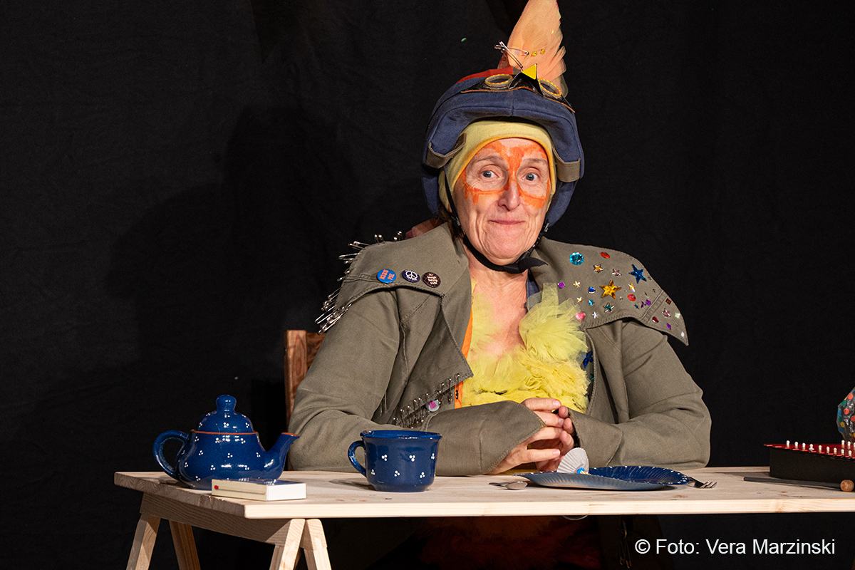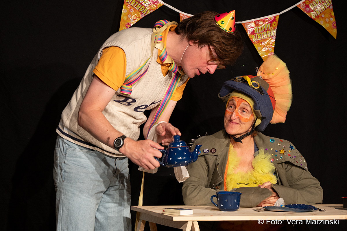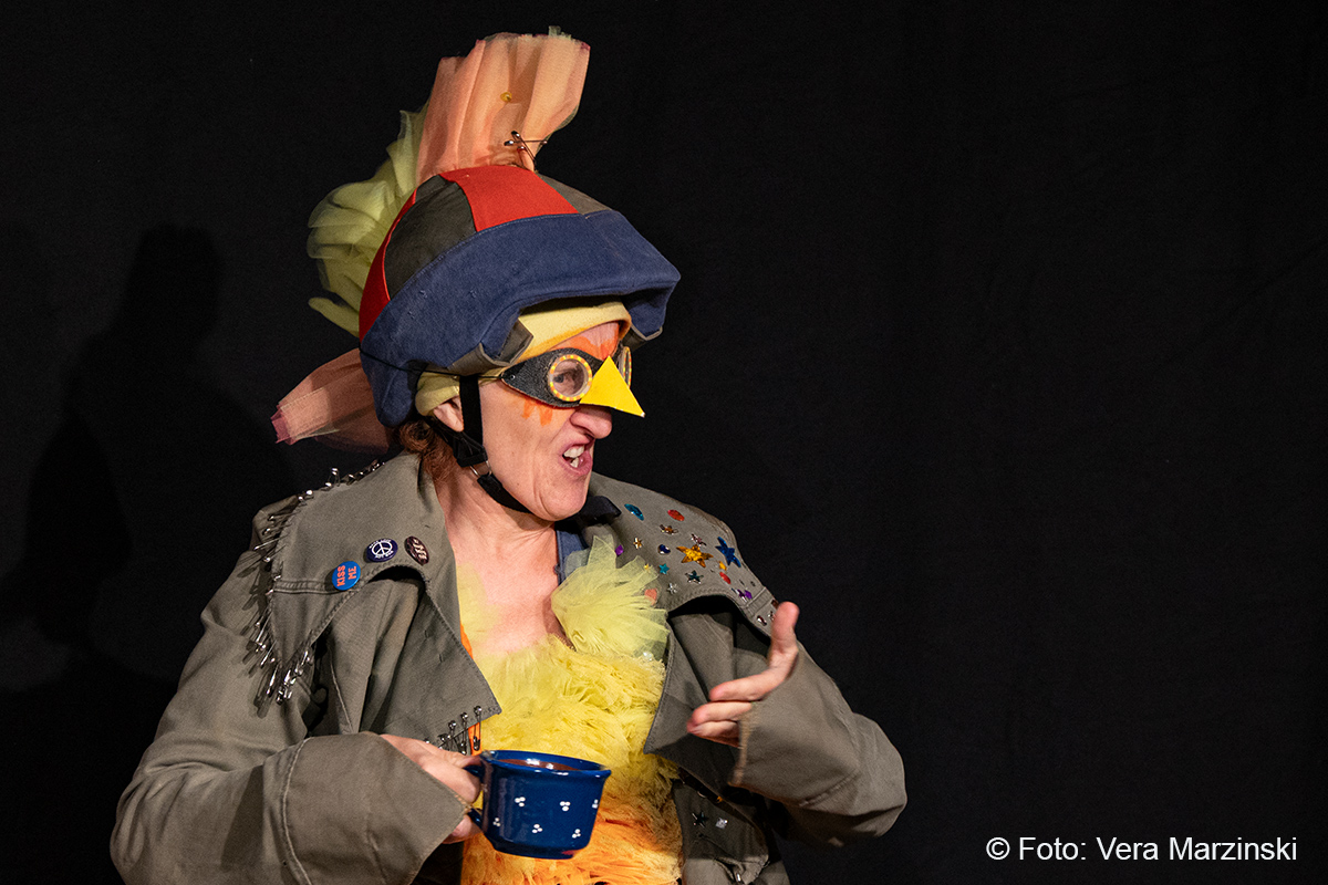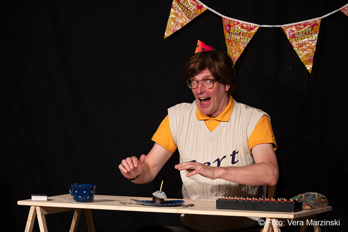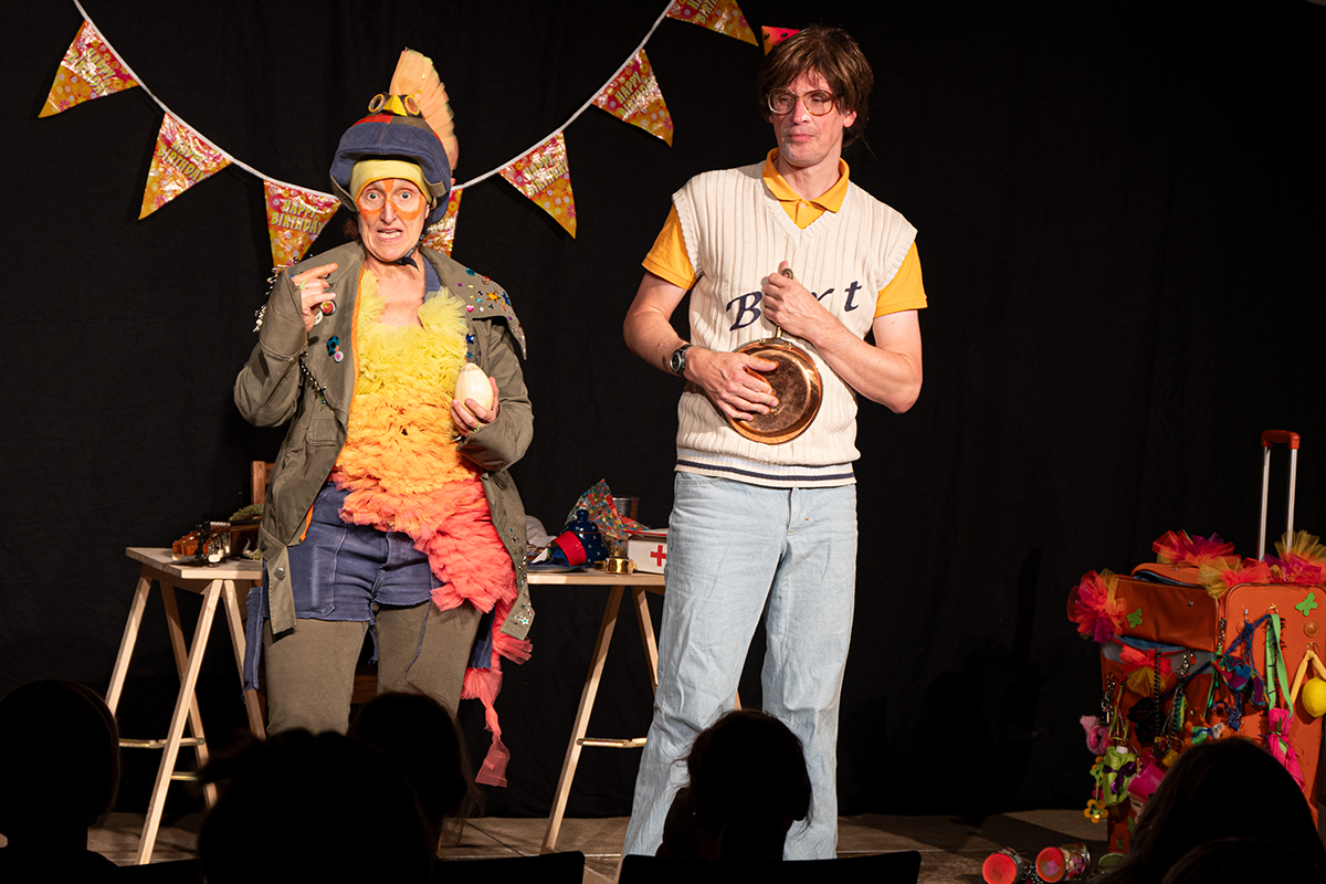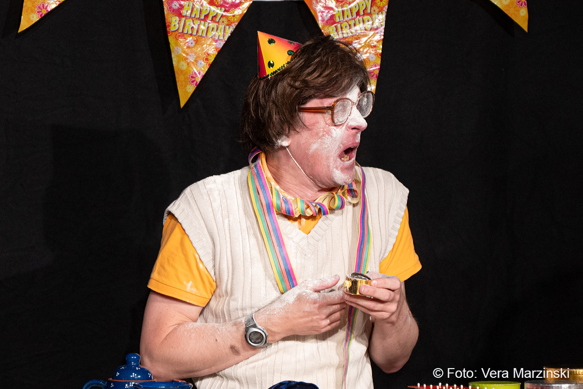 „R.A.M. – Happy Bird’s Day“ ist ein englischsprachiges Stück für Kinder im Grundschulalter. Eine „Happy English Lesson“ mit viel Live-Musik und -Gesang. Denn ohne Verständnisschwierigkeiten konnten selbst die kleinsten Gäste in die Fremdsprache eintauchen. Die pointen- und temporeiche Geschichte erklärte sich allein aus den Handlungen auf der Bühne. Da feierte Bert seine „Happy Birthday to me“ -Party mit Konfetti, Musik und gedecktem „table“. Kein Besuch in Sicht - nicht im Treppenhaus, nicht in der Garderobe. Doch dann kam der bunte Vogel „Happy bird“ und sang ein „If you happy and you know it“. Es sei der „Happy bird-day“ und nicht der „birth day“, fand der bunte Vogel. Bert hätte dann wohl doch lieber alleine weiter gefeiert, aber der „Happy Bird“ ließ sich nicht so schnell vertreiben. Der trieb mit Bert zudem auch noch so einigen Schabernack, wie Mehl ins Gesicht pusten oder auch Dosen und Musikgegenstände auf Berts Kopf und Armen stapeln. Die Kinder im Publikum hatten ihren Spaß mit den beiden. Nebenbei erklärten Bert und Bird ganz einfach „empty“ und „full“ – leer und voll – oder auch „up“ und „down“ sowie „in“ und „out“. Und der gekleckerte Tee auf dem Shirt? Das war dann wohl ein T-Shirt. Ei ist egg und wie sollte das frisch gelegte Ei von Bird dann wohl heißen? Natürlich „Eggbert“ oder doch lieber „Eggbird“.