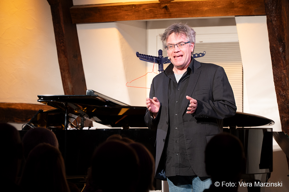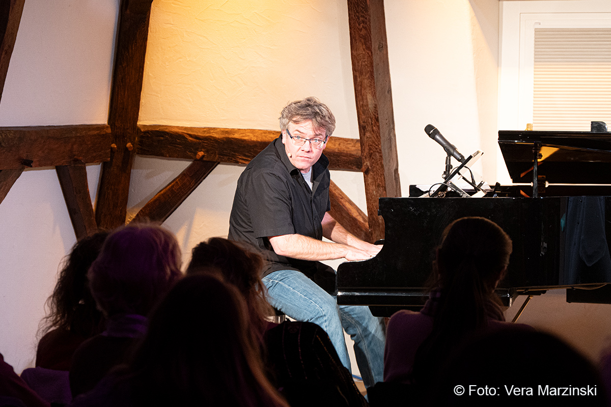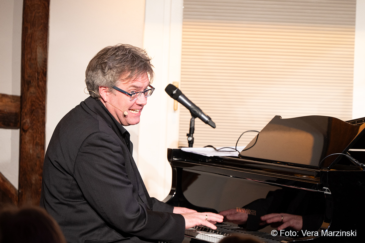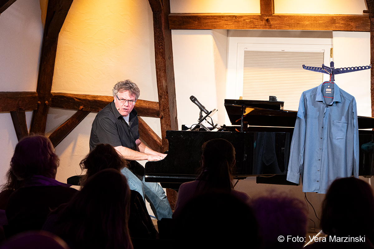 Matthias Reuter stammt aus Oberhausen und weiß „Ich bin noch gut“ – und das war der Musikkabarettist beim Abend im Burghaus Bielstein auch. Wenn auch die Veranstaltung in kleinerem Rahmen stattfand, das Publikum machte Lärm für 100 zur Begrüßung und auch zwischendurch – und konnte am nächsten Tag erzählen was andere hier verpasst hatten. Passend zum Programm-Motto gleich beim ersten Lied der Satz „Der ist doch noch gut“. Im Lied mit diesem Titel ging es unter anderem um Glühwein und das Bielsteiner Publikum - das durfte gleich mal mitsingen – und um Friedrich Merz, der sich so oft zur Wahl stellte bis man ihm nahm.