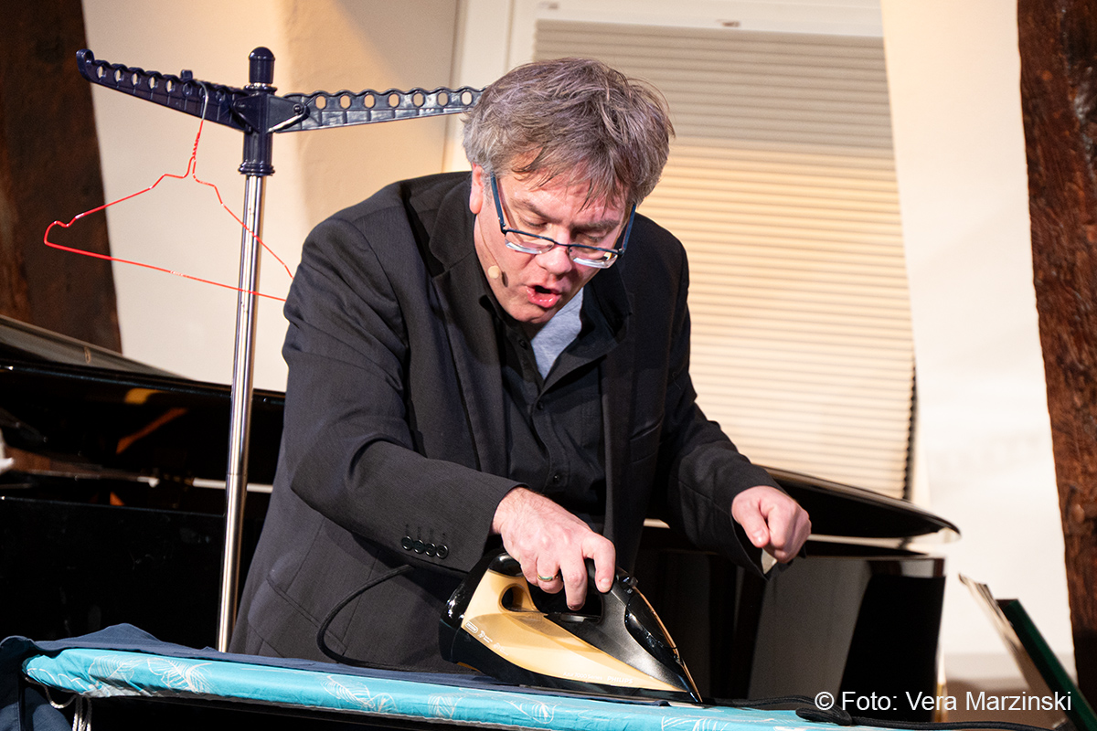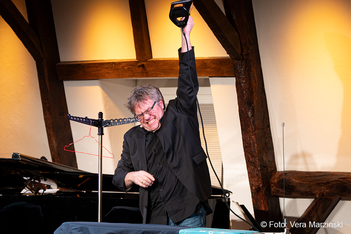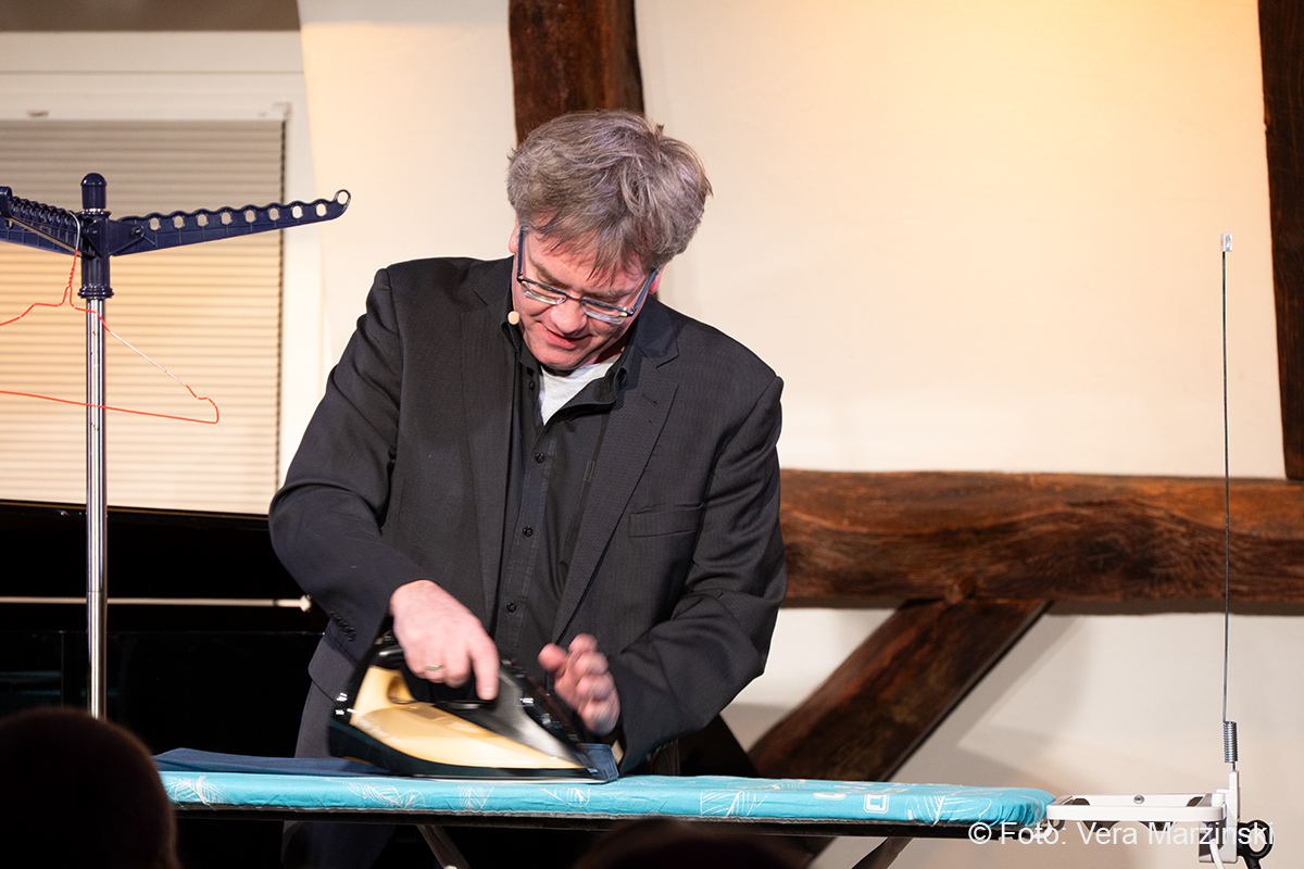 Glühwein brauchten er und die Gäste nicht. Hier seien die Veranstaltungsräume noch beheizt, nicht wie im Ruhrgebiet, wo er herkomme, strahlte er glücklich. Und einheizen konnte Reuter zudem mit seiner Musik und seinen Kabarett-Einlagen. Heiß wurde es dann dem Bügeleisen. Er bügle unheimlich gern und habe für sich die Bügellyrik gefunden, verriet er. Eine besondere Variante: Physio-Bügel-Lyrik und die erforderte absolutes Multitasking, denn es gab auch noch ein Ringelnatz Turngedicht dazu. Als nicht wirklich gut gebügelt beurteilte eine Zuschauerin das Hemd, dass er beim Bügel-Song bearbeitete. Er habe die Schultern vergessen. Aber das nahm er mit einem Augenzwinkern und machte noch ein paar Dehnübungen am Bügelbrett. Selbst ein Gedicht zur Weihnachtszeit hatte er dabei. Das hatte viel zu tun mit dem Satz „wer kriegt dieses Jahr die Omma“. Und „Gute Vorsätze“ fürs Neue Jahr wurden besungen. „Darf die künstliche Intelligenz mit meinen Daten trainiert werden?“, fragte er sich - und machte daraus einen Boogie-Woogie