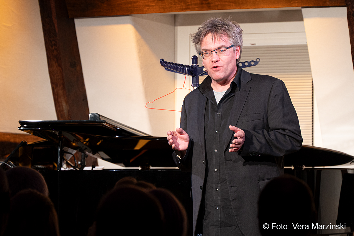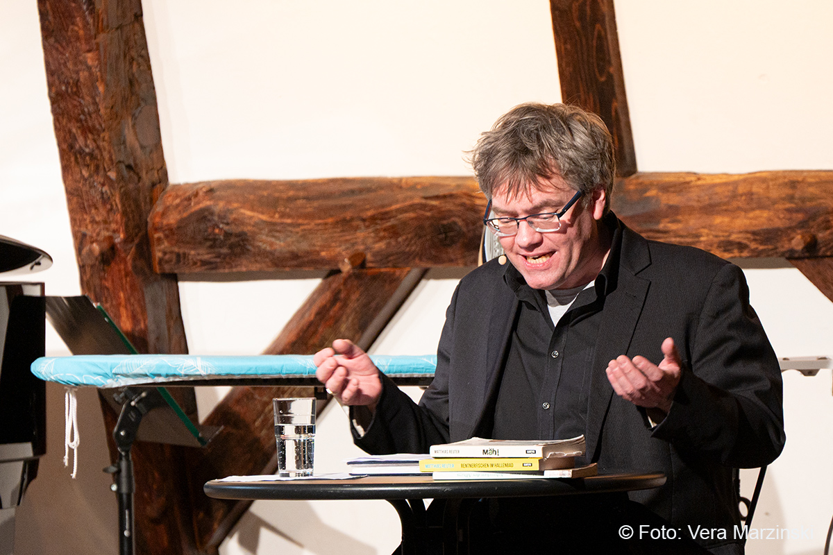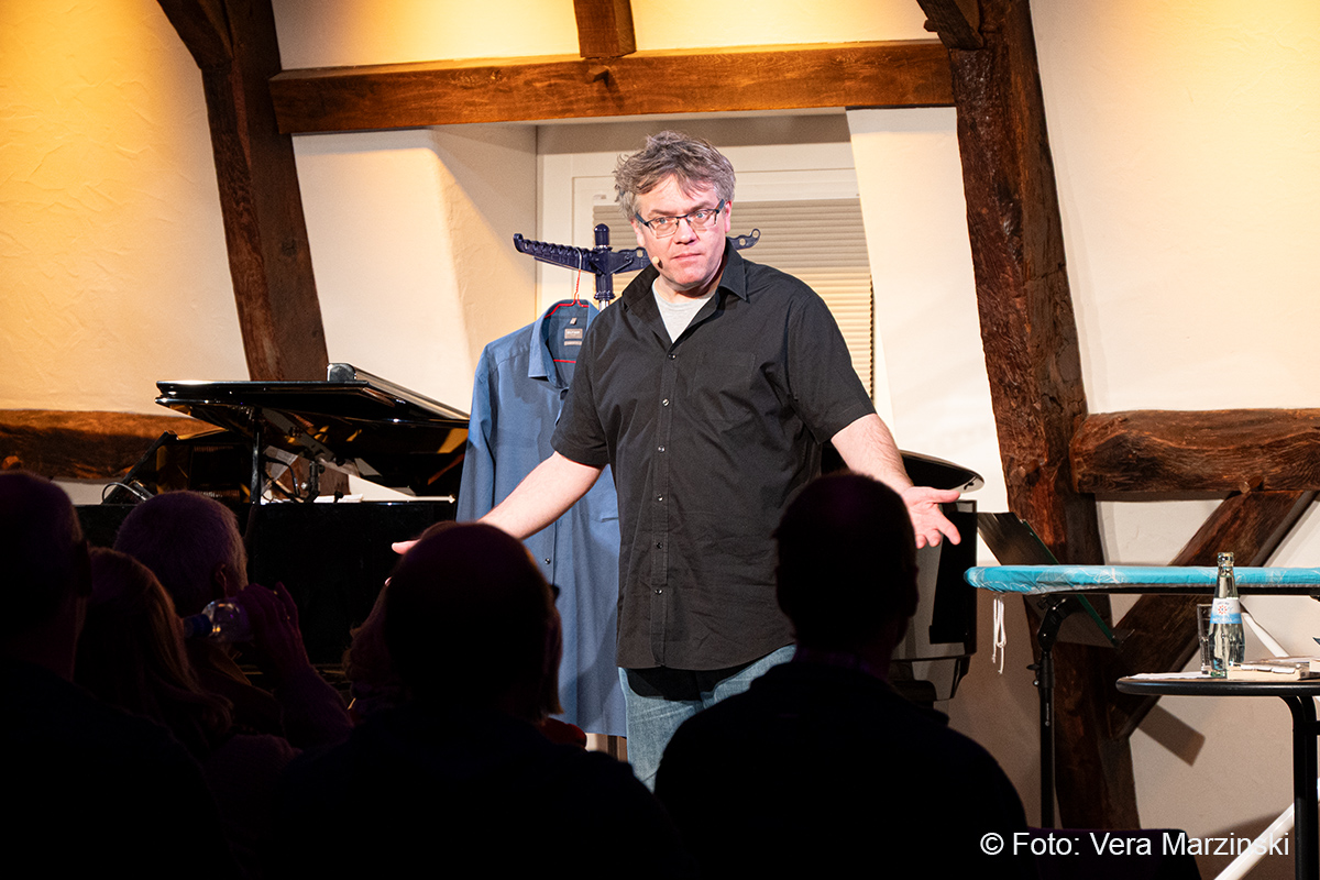 Außerdem gab es noch kurze Einblicke in seine Kurzgeschichtenbücher „Mäh“ und „Rentnerfischen im Hallenbad“. Matthias Reuter ist bislang schon diverse Male mit Kabarettpreisen ausgezeichnet worden, wie mit dem Publikumspreis des Hessischen Kabarettpreises 2018, aber auch mit der Jurypreis-Kappe des Wettbewerbs Tegtmeiers Erben (2011), dem Bottroper Frechdax sowie 2020 mit dem Herborner Schlumpeweck. Seit über zehn Jahren begrüßt Matthias Reuter beim Bier- und Leseabend in Oberhausen Bühnenkolleginnen und -kollegen, die Geschichten lesen oder Songs spielen. Der nächste ist am 31.12.2025. Studiert hat er Germanistik, neuere Geschichte und Philosophie, was er als Kleinkunst-Fachabitur bezeichnet. Und seit 2010 kann er davon leben. Bis 2070 muss er davon leben (sage sein Rentenbescheid). Wenn er weiter so macht, klappt das sicher, denn er „ist immer noch gut“.