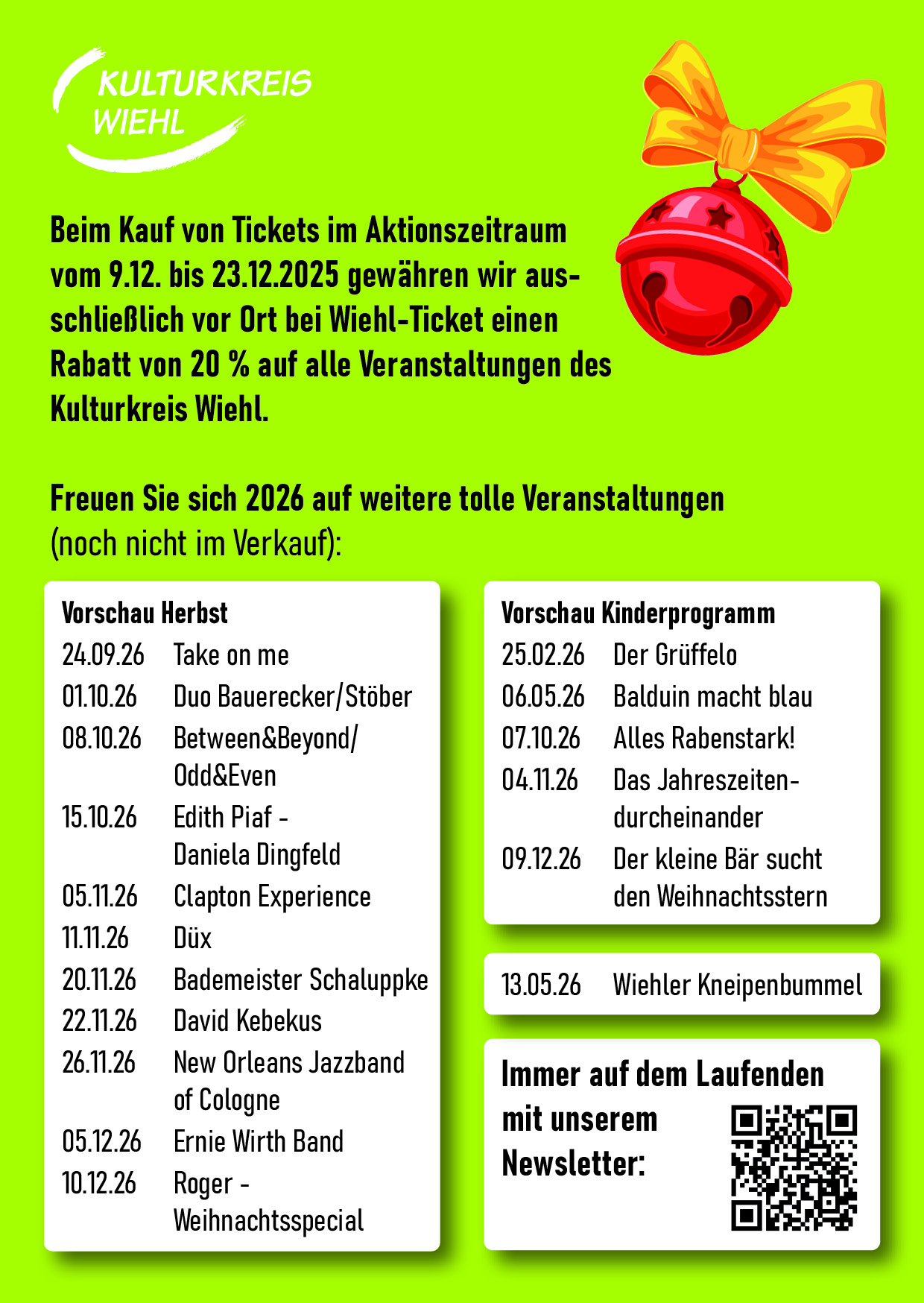 Sie haben hoffentlich auch schon die ersten Adventskalendertürchen geöffnet? Wir freuen uns, am 9. Dezember die Tür unserer frisch renovierten Vorverkaufsstelle Wiehl-Ticket erneut für Sie öffnen zu können und möchten Sie auf einen Besuch einladen. Als besondere Aktion geben wir ausschließlich vor Ort 20% Rabatt auf alle Tickets des Kulturkreis Wiehl! (So lange Vorrat reicht und nicht mit anderen Rabatten kombinierbar)