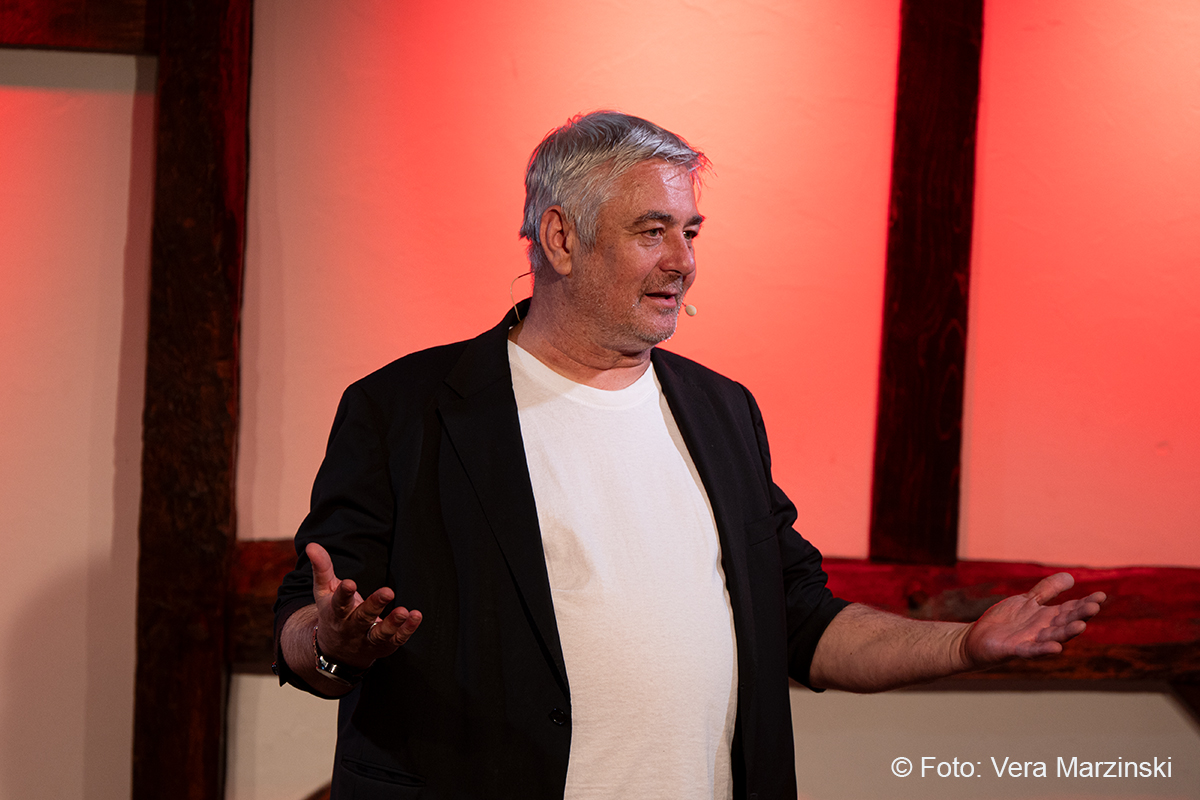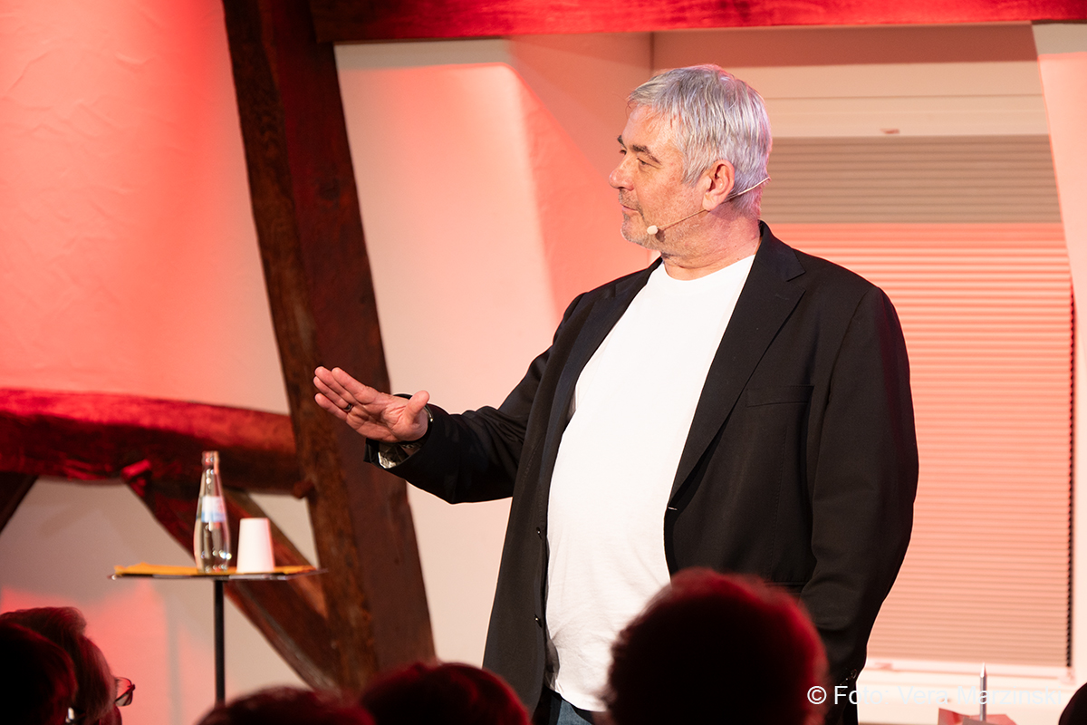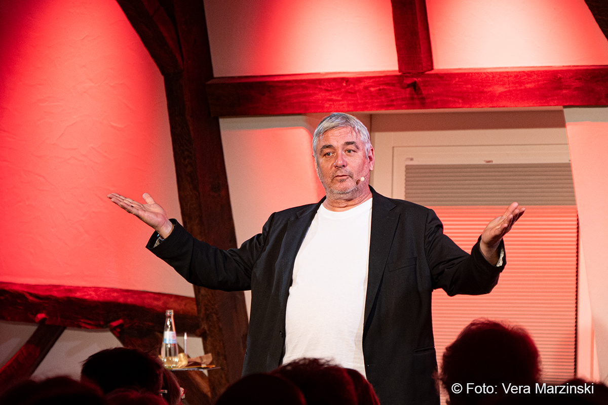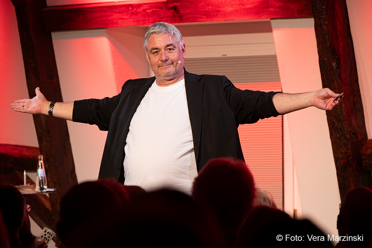Aber er erzählte nicht nur, er band das Publikum auch mit ein. Seine Familie sei eine Buch- und Spielefamilie, denn Kreativität sei ihm wichtig. Deshalb machte er auch eine Kreativ-Übung mit dem Publikum – und verblüffte alle. Zaubern sei wichtig in dieser Zeit. Das wären handgemachte Wunder, bei denen man Staunen könne und genau das sei so wichtig in dieser Zeit. Da wo KI Stimmen nachmachen kann, dass man gar nicht merke, dass man nicht mit einer nahestehenden Person spricht.
