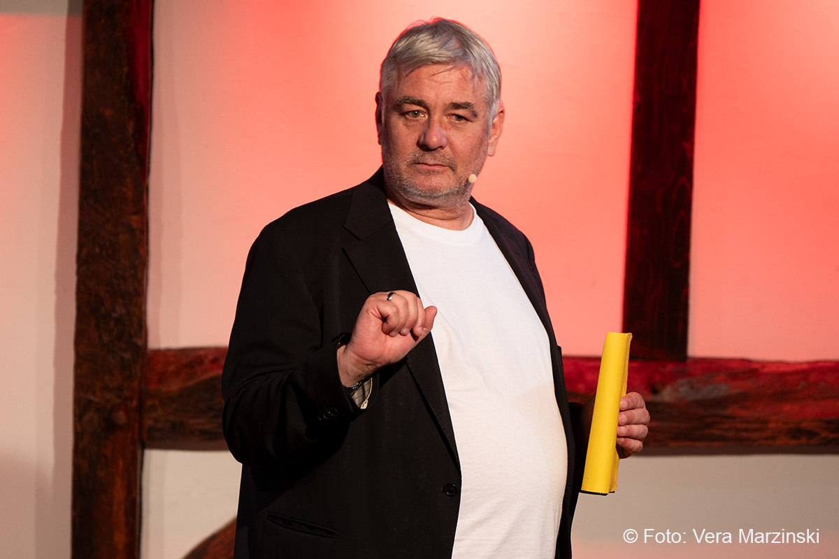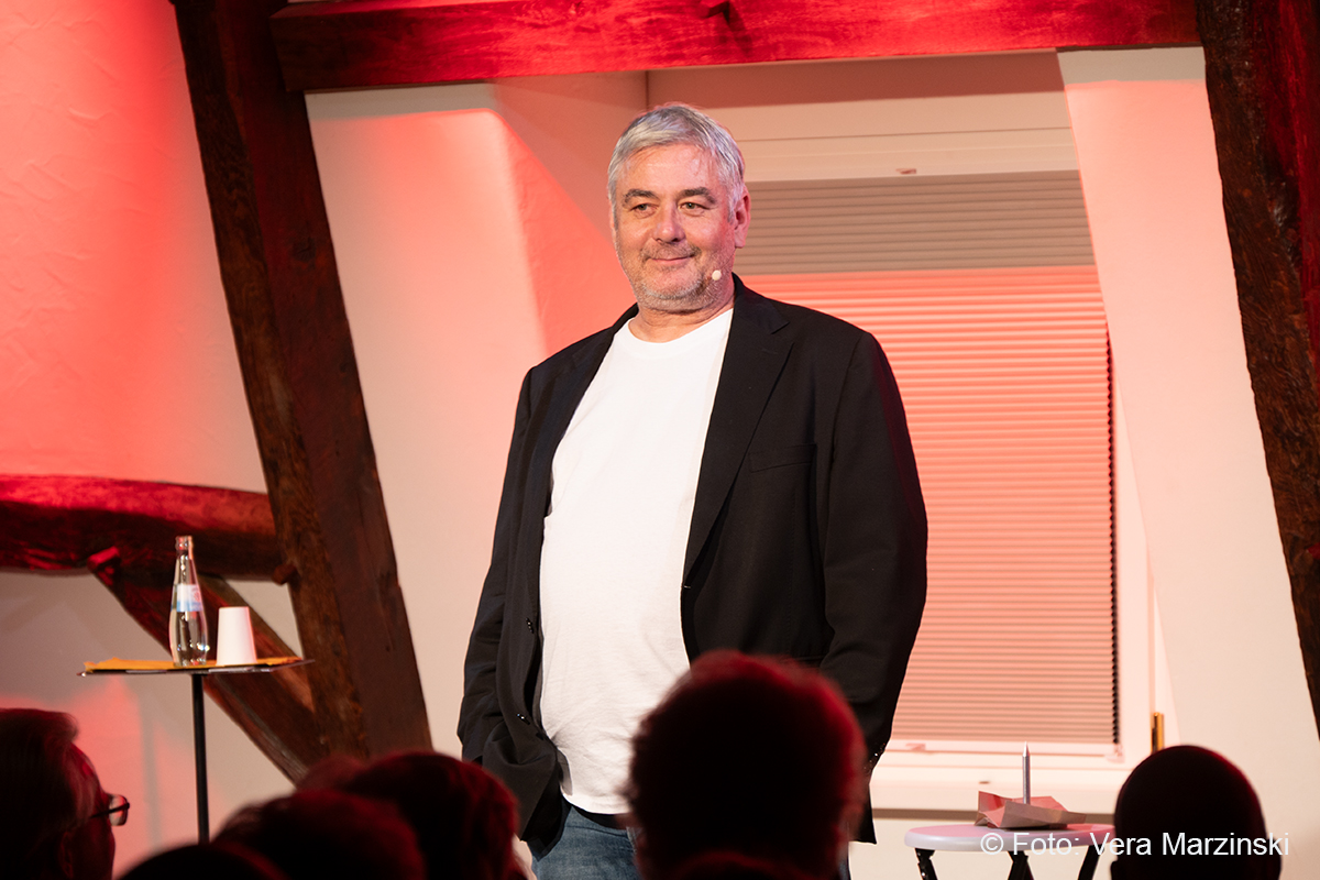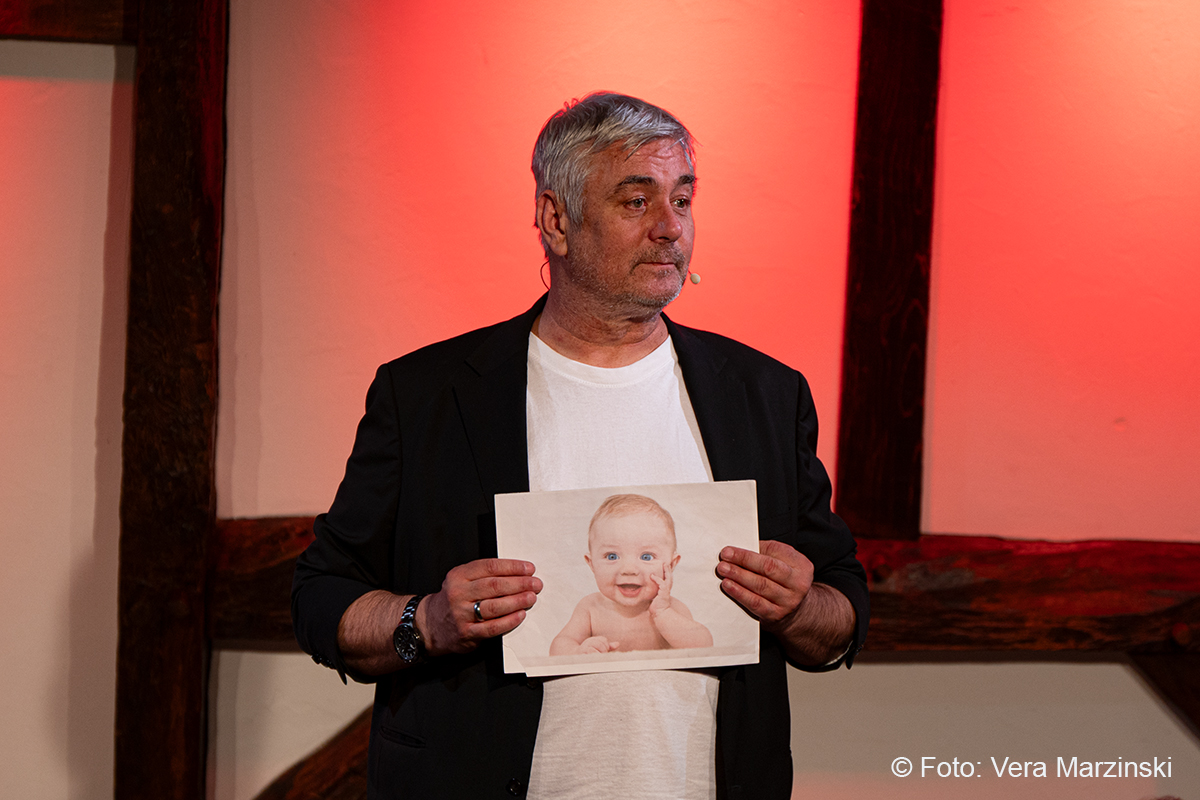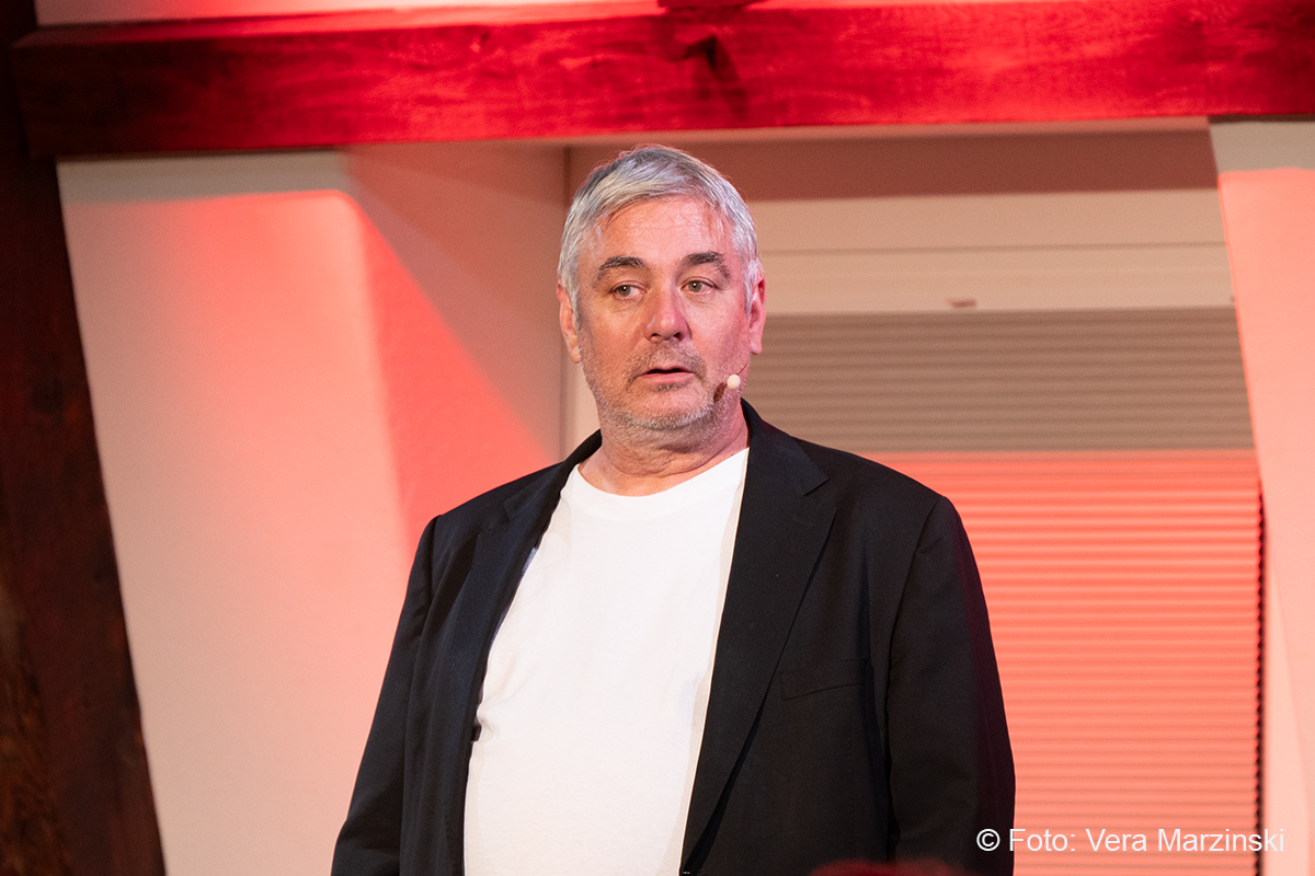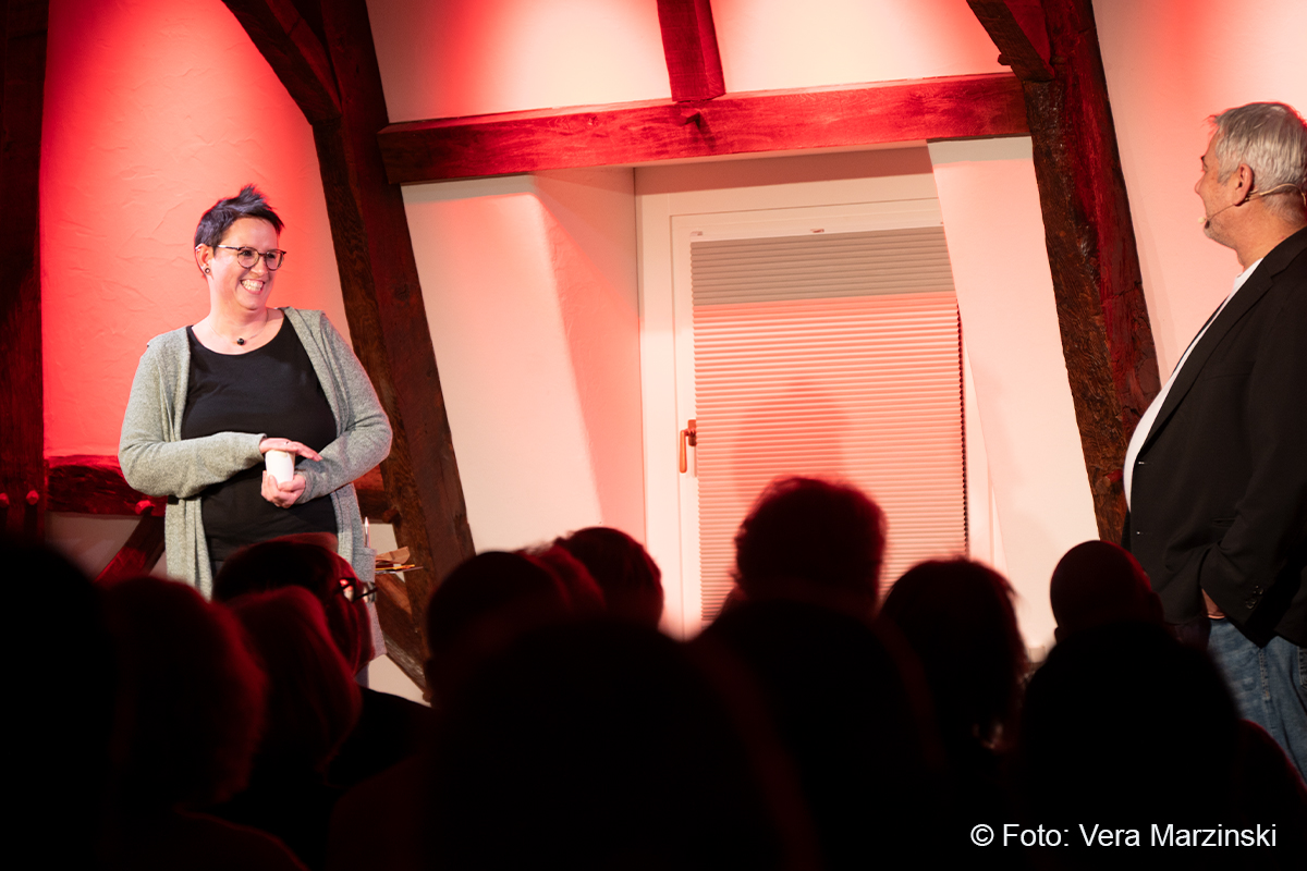 Aber er erzählte nicht nur, er band das Publikum auch mit ein. Seine Familie sei eine Buch- und Spielefamilie, denn Kreativität sei ihm wichtig. Deshalb machte er auch eine Kreativ-Übung mit dem Publikum – und verblüffte alle. Zaubern sei wichtig in dieser Zeit. Das wären handgemachte Wunder, bei denen man Staunen könne und genau das sei so wichtig in dieser Zeit. Da wo KI Stimmen nachmachen kann, dass man gar nicht merke, dass man nicht mit einer nahestehenden Person spricht.