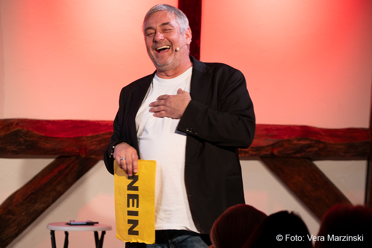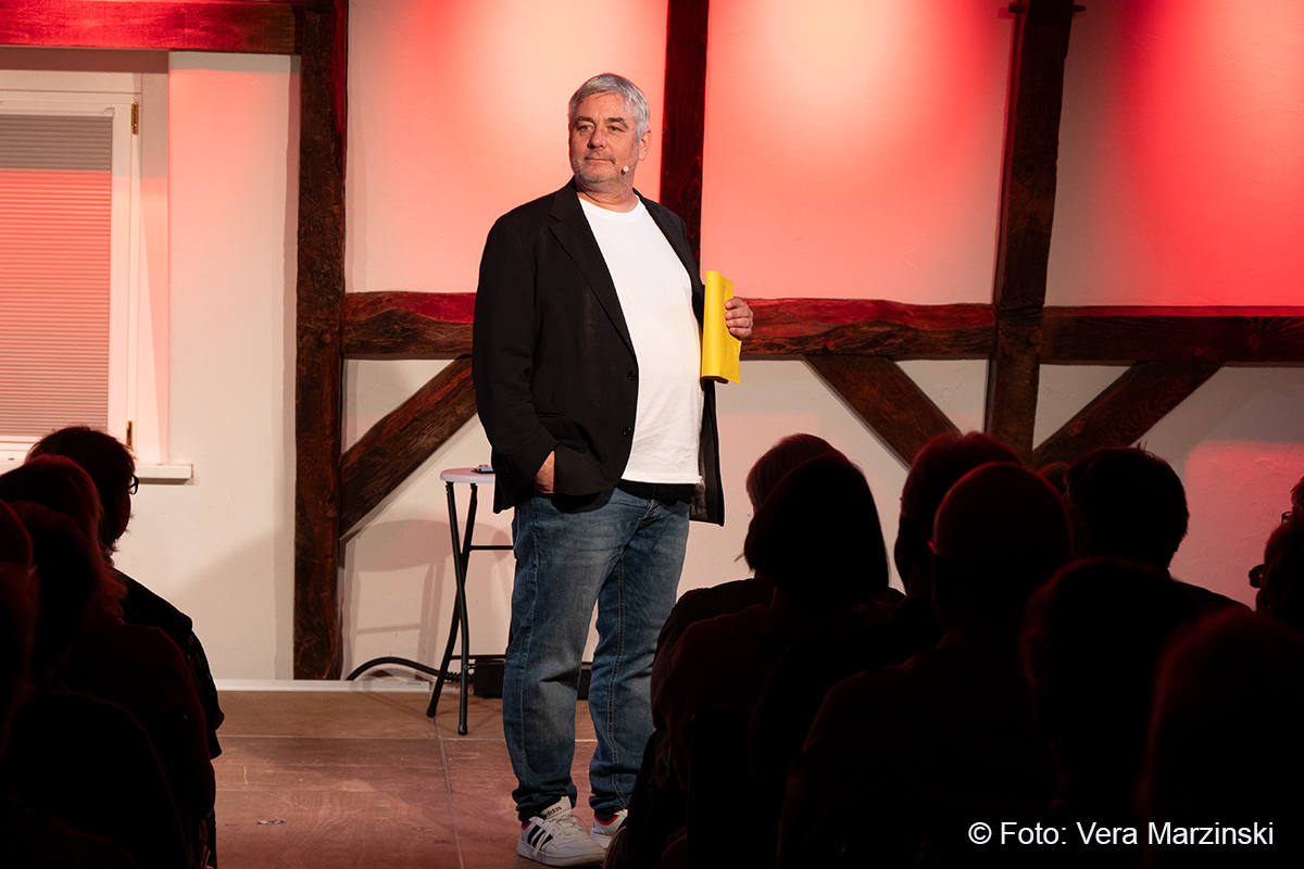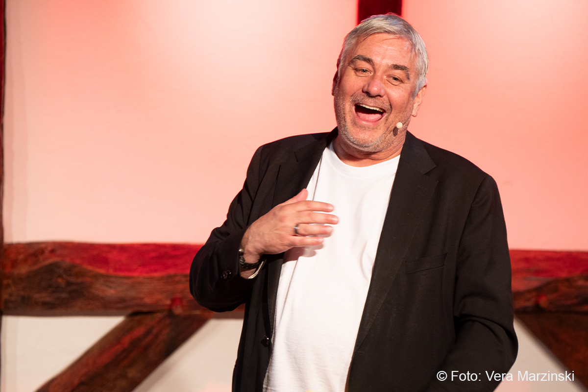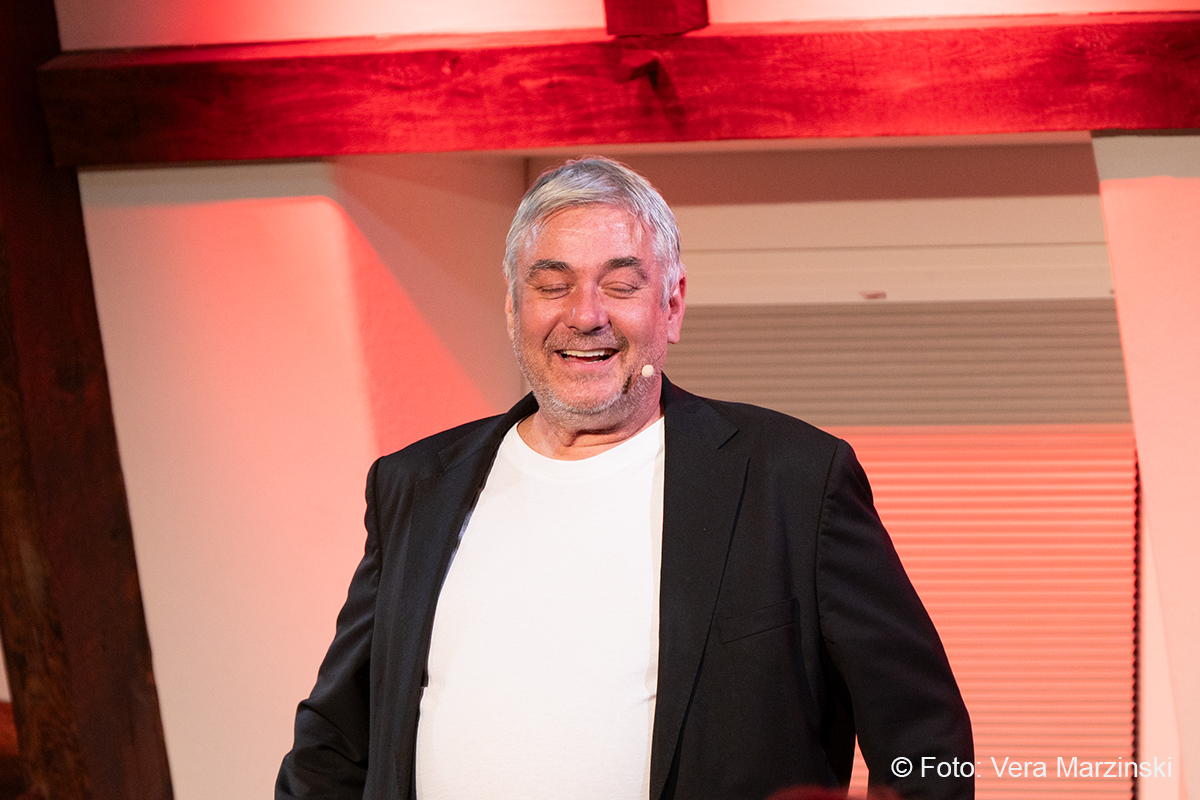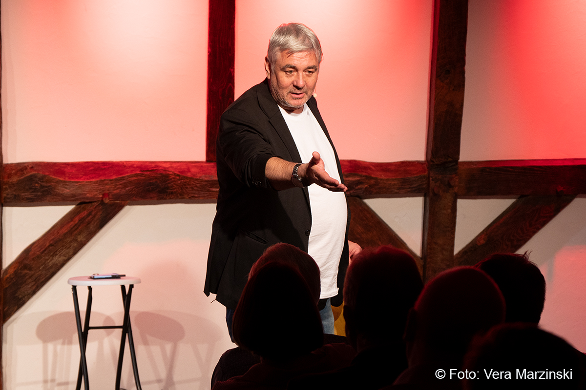 Vor elf Jahren war er schon einmal im Burghaus Bielstein und stellte fest: „Ihr habt hier komplett einen an der Waffel“. Er kann wunderbar über sich selbst lachen und er liebt es, wenn Menschen über ihn lachen. Und Lachen sei so wichtig - einfach mal alles vergessen, das wollte er für das Publikum an diesem Abend. Dabei wollte er die Politik raus lassen. Ingo Oschmann arbeitet seit über 30 Jahren als Zauberkünstler, Stand-up Comedian, Moderator, Schauspieler, Podcaster, Schriftsteller und Humorist – und das beherrscht er alles grandios. Kein anderer Comedykünstler schafft den Spagat zwischen Stand up Comedy, Improvisation und feiner Zauberei so gekonnt, wie er.