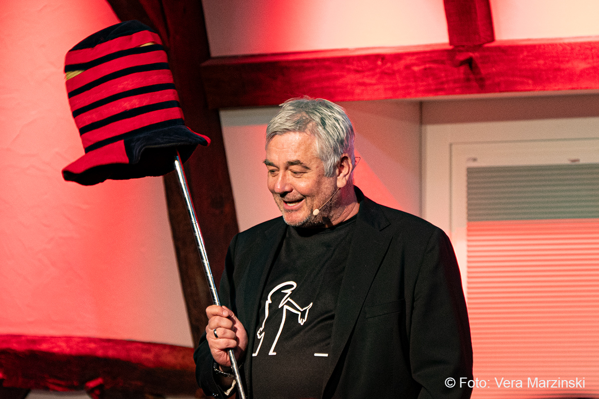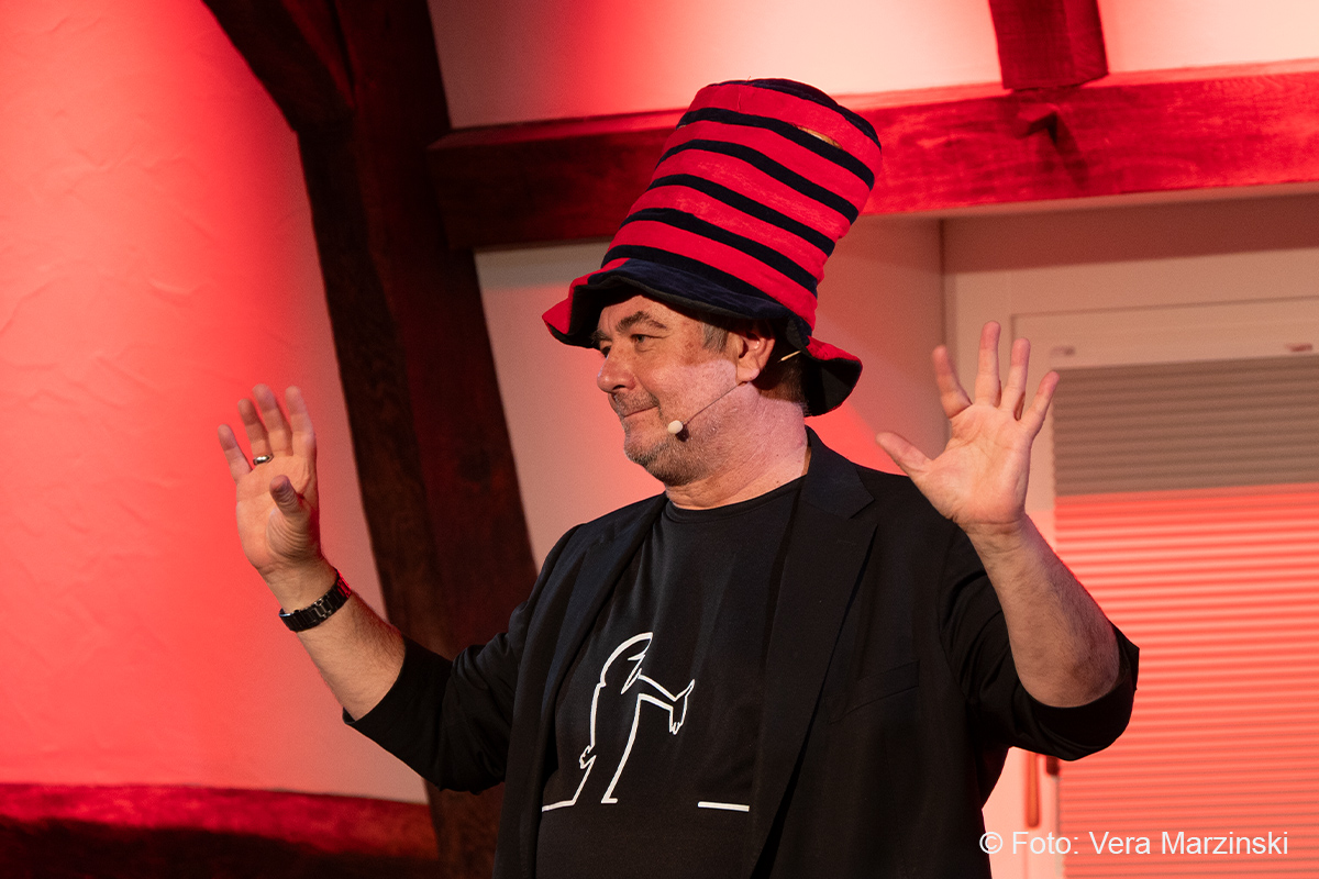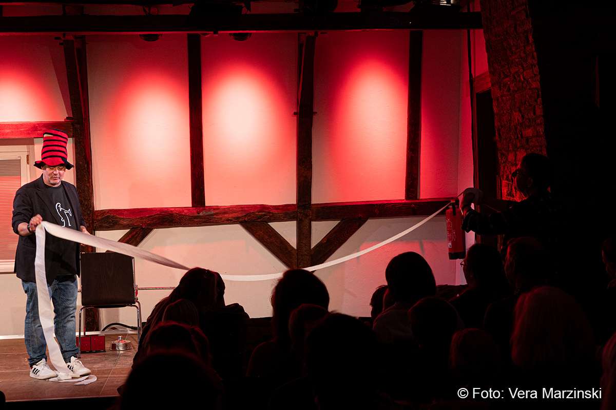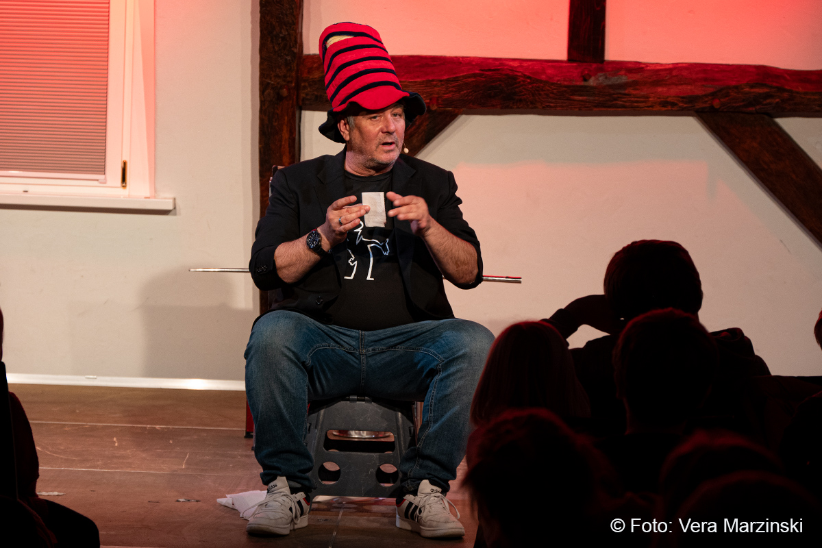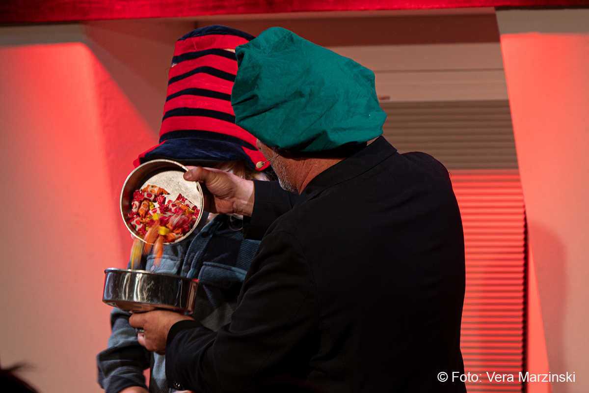„Was fehlt Euch denn? Ich sehe wohl nicht aus wie ein Zauberer?!“ Aber er hatte einen Zauberhut dabei und mit dem könne jeder Zaubern. Zudem gab es bei ihm die Lautstärke-Regeln - die klappten tatsächlich. Nach jedem Trick wiederholte er sie und daran hielten sich alle: „Wenn ich „eins“ sage, seid ihr leise, wenn ich „zwei“ sage, haltet ihr euch die Ohren zu und wenn ich „drei“ sage, schreit ihr so laut ihr könnt!“. Auch ein Ruhe-Zeichen wurde direkt etabliert und bei astreinem Mitwirken eine Überraschung versprochen. Die Taktik ging auf, denn es war für die Kinder unglaublich spannend, was da auf der Bühne geschah. Aber auch die großen Gäste, die mit dabei waren durften mal laut brüllen – wie Rainer, der später auch noch als Toilettenpapier-Halter fungierte.