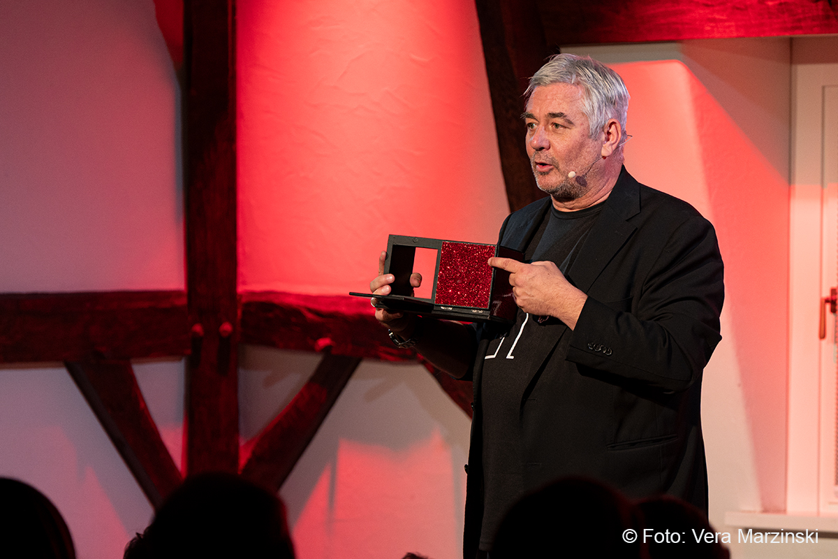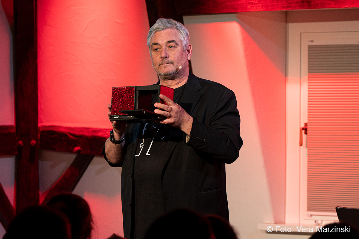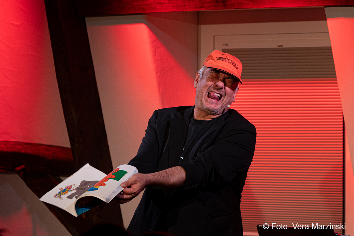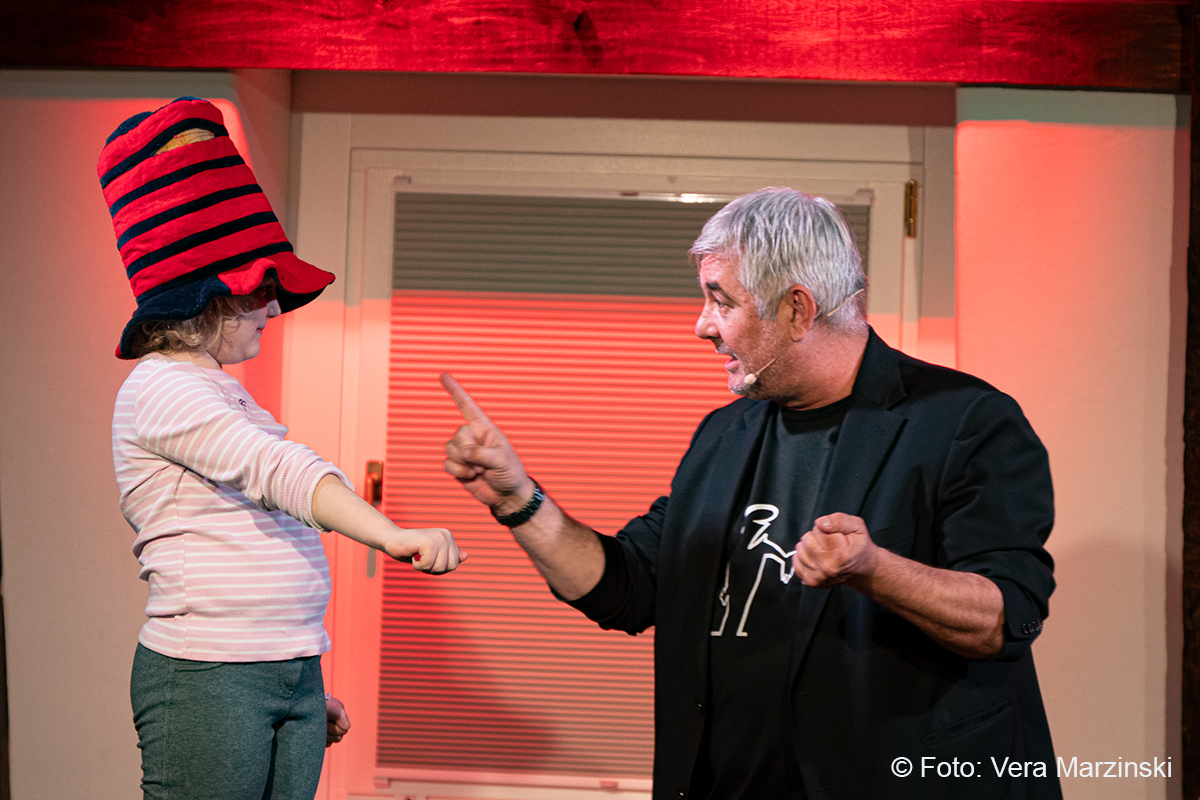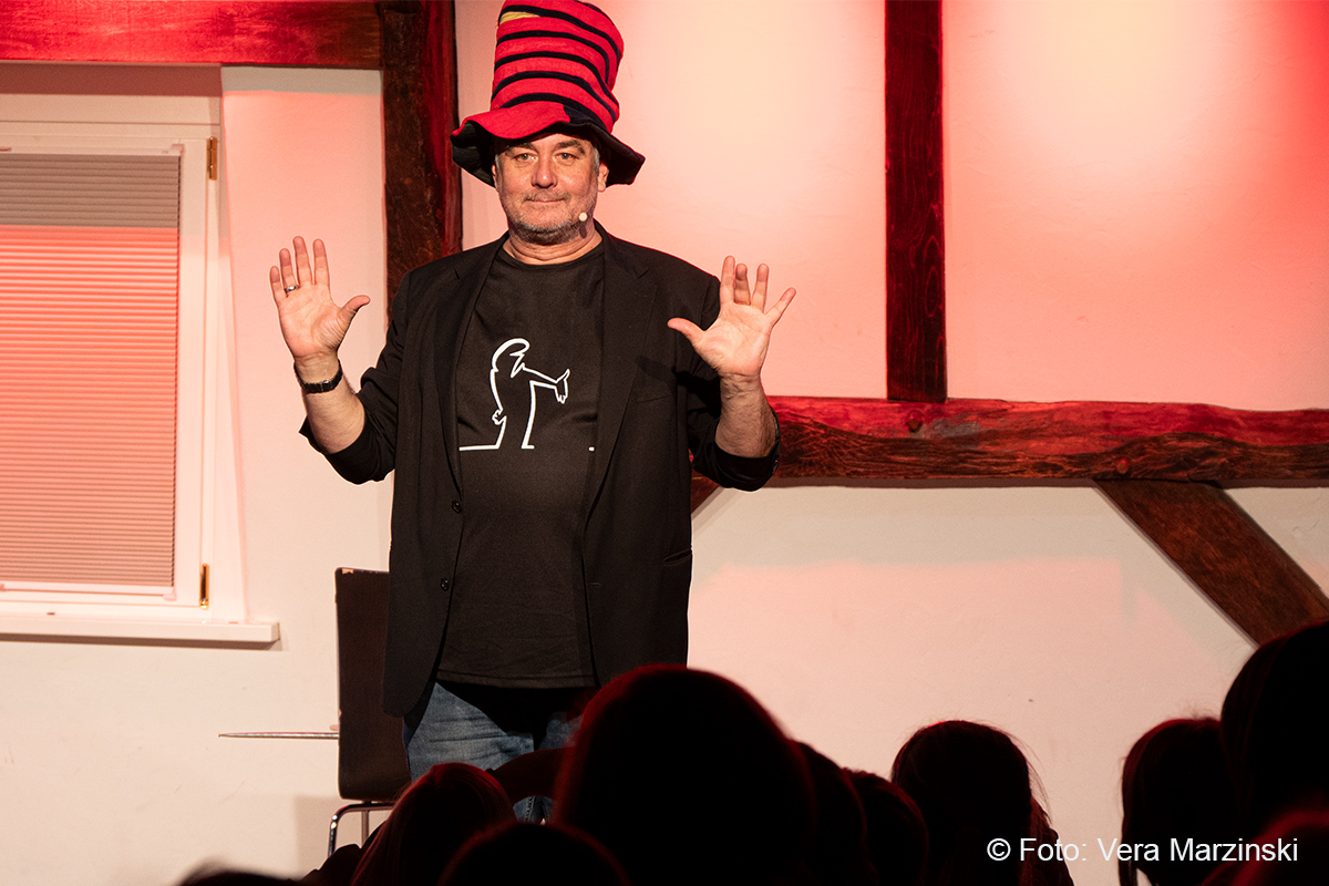 „Was fehlt Euch denn? Ich sehe wohl nicht aus wie ein Zauberer?!“ Aber er hatte einen Zauberhut dabei und mit dem könne jeder Zaubern. Zudem gab es bei ihm die Lautstärke-Regeln - die klappten tatsächlich. Nach jedem Trick wiederholte er sie und daran hielten sich alle: „Wenn ich „eins“ sage, seid ihr leise, wenn ich „zwei“ sage, haltet ihr euch die Ohren zu und wenn ich „drei“ sage, schreit ihr so laut ihr könnt!“. Auch ein Ruhe-Zeichen wurde direkt etabliert und bei astreinem Mitwirken eine Überraschung versprochen. Die Taktik ging auf, denn es war für die Kinder unglaublich spannend, was da auf der Bühne geschah. Aber auch die großen Gäste, die mit dabei waren durften mal laut brüllen – wie Rainer, der später auch noch als Toilettenpapier-Halter fungierte.